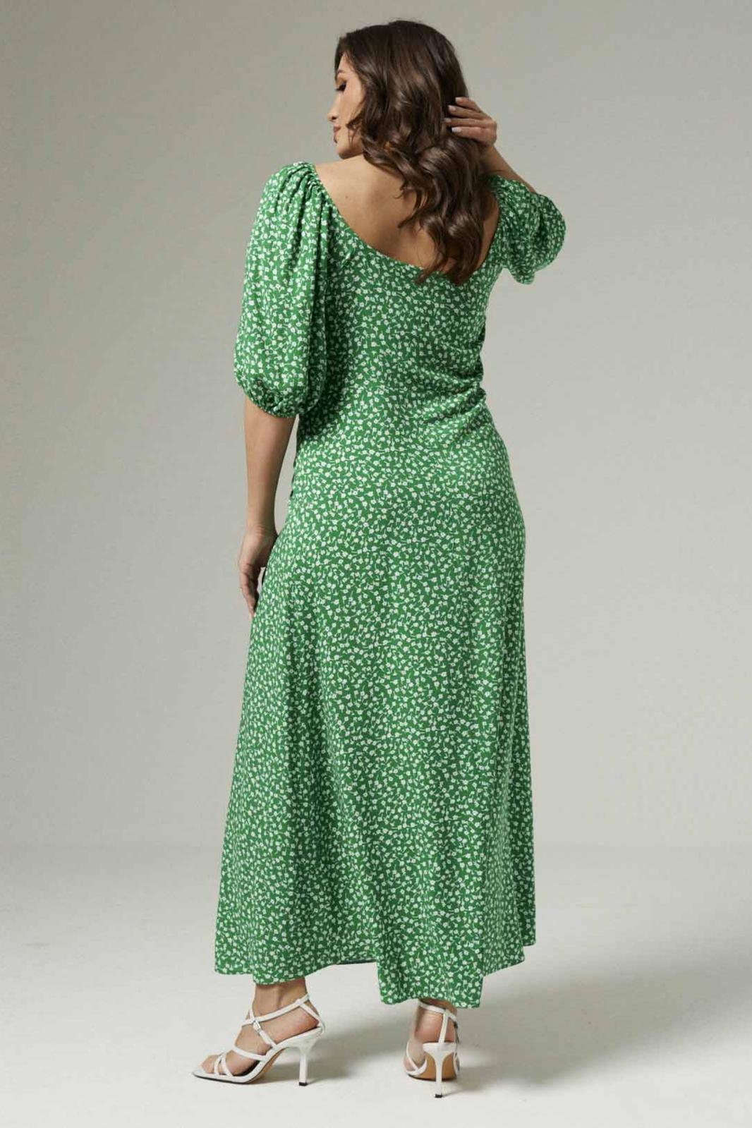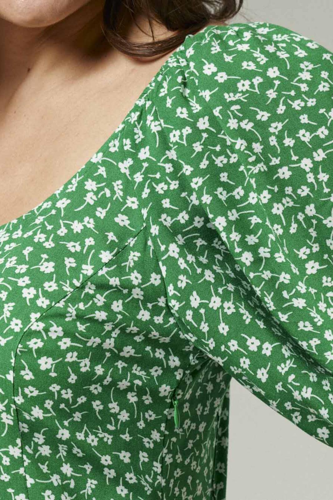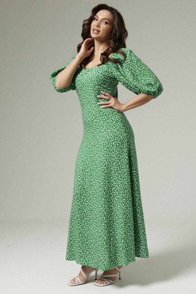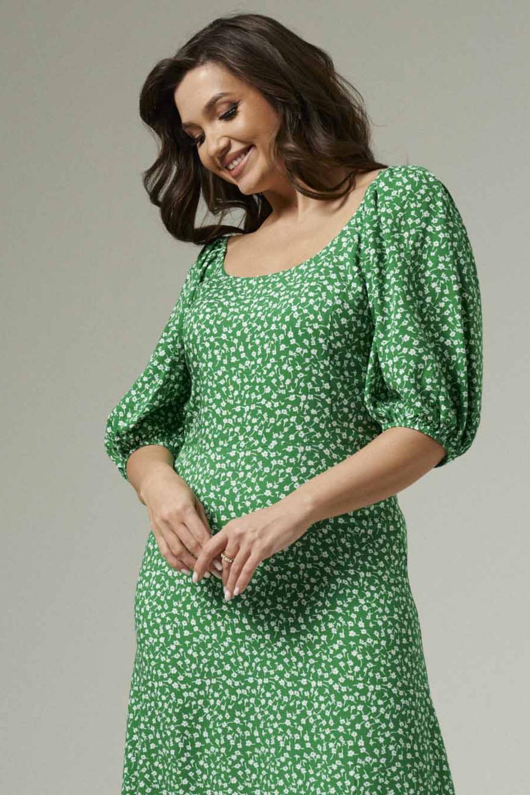 Платье женское ииз вискозной ткани для повседневной носки. Изделие А- силуэта, отрезное по талии. Рукав короткий в виде фонарика. Застегивается платье на потайную молнию в боковом шве. Горловина изделия U- образная. Длина платья до середины голени.