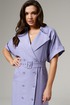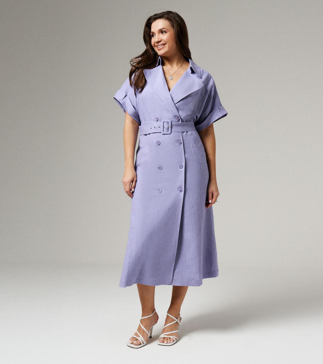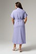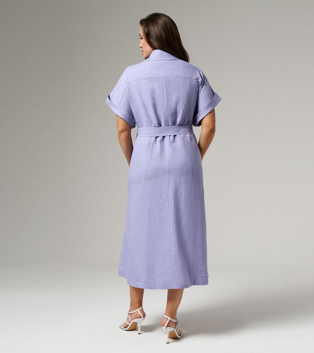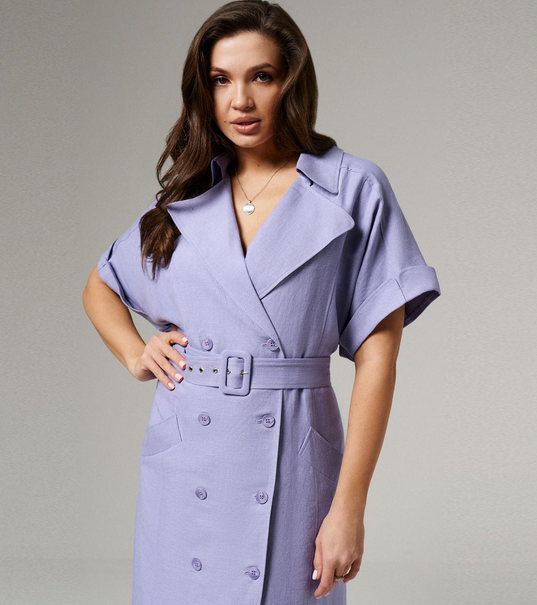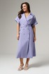 Платье женское из вискозной ткани с добавлением льна для повседневной носки. Платье на запах А- силуэта с коротким цельнокроеным рукавом, оформленным притачной отложной манжетой. Воротник отложной. По переду рельефные швы. Застегивается на пуговицы. По переду прорезные карманы. Спинка с отрезной кокеткой и рельефными швами. Длина изделия до середины голени. Платье укомплектовано поясом из основной ткани изделия.