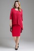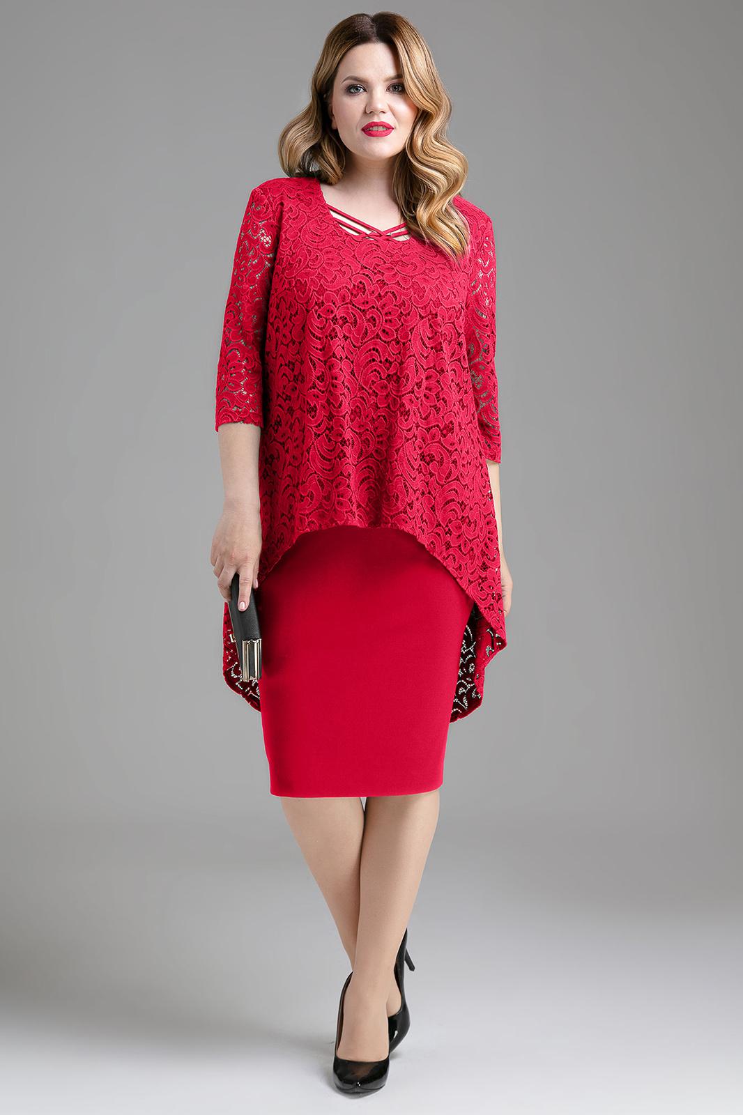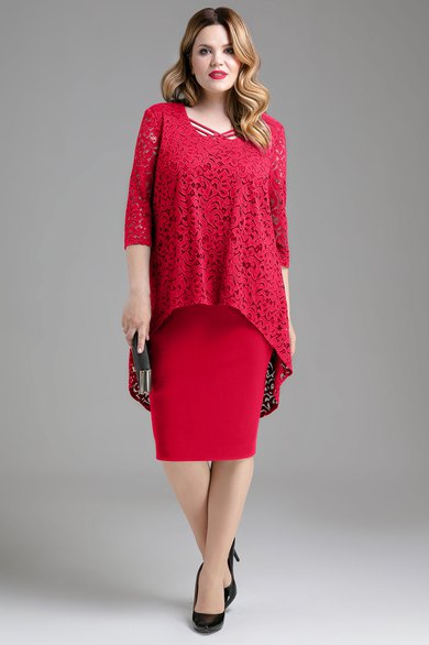 Нарядное платье из однотона и кружева с имитацией блузки. Нижний слой платья -футляр, с талиевыми и нагрудными вытачками, в боковом шве молния, верхняя деталь из кружева, разведенная с перепадом длины, спинка длиннее переда, круглый вырез горловины, с декоративными шлевками и двумя пришивными стразами. Спинка с каплевидным разрезом от горловины на одну пуговицу. Вы уже - идеал для подражания.