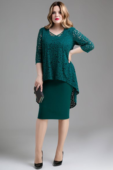 Нарядное платье из однотона и кружева с имитацией блузки. Нижний слой платья -футляр, с талиевыми и нагрудными вытачками, в боковом шве молния, верхняя деталь из кружева, разведенная с перепадом длины, спинка длиннее переда, круглый вырез горловины, с декоративными шлевками и двумя пришивными стразами. Спинка с каплевидным разрезом от горловины на одну пуговицу. Вы уже - идеал для подражания.
