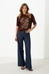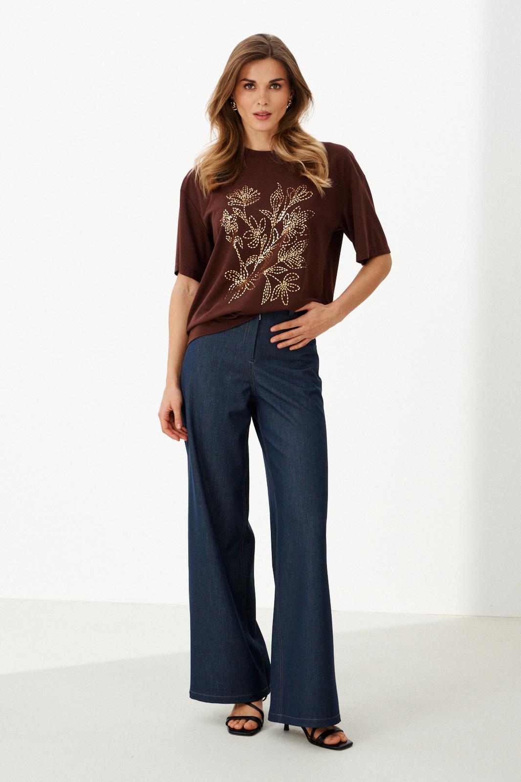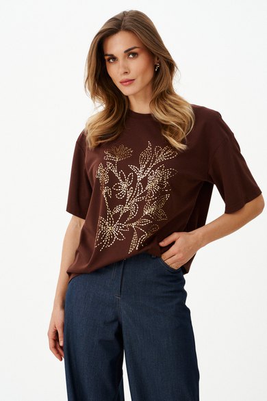 Женский джемпер из поливискозного трикотажного полотна, идеально подходящий для повседневной носки. Модель выполнена прямого силуэта, что обеспечивает свободу движений и комфорт. На передней части джемпера расположена декоративная печать в виде цветов. Горловина обработана притачной тесьмой, что гарантирует аккуратный и прочный финиш. Линия плеча спущена, создавая расслабленный и современный образ. Рукава втачные, длиной чуть ниже уровне локтя, что добавляет удобство в носке. Этот стильный, удобный и универсальный джемпер станет яркой деталью вашего гардероба. Благодаря комфортному крою и модным акцентам вы будете чувствовать себя уверенно и выглядеть современно. Цвет джемпера — коричневый, он придаст вашему образу стильный акцент и запоминающийся вид.