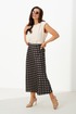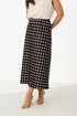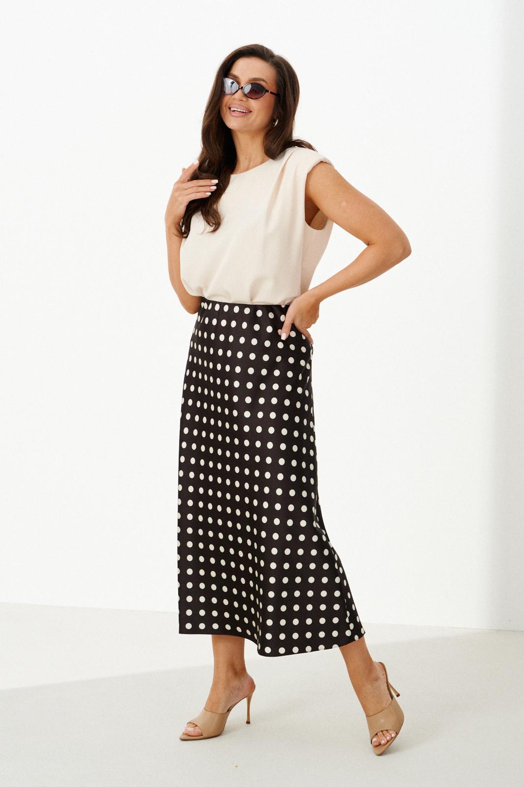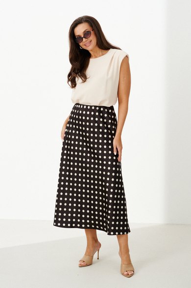 Элегантная женская юбка из атласной ткани идеально подойдет для повседневной носки. Модель расширяется к низу, создавая изящный силуэт и комфортную посадку. Верхний срез юбки оформлен на внутренней резинке закрытой вискозной подкладкой, которая обеспечивает дополнительное удобство и хорошую фиксацию. Задняя часть юбки украшена двумя талиевыми вытачками, которые подчёркивают талию и придают изделию аккуратный вид. Основной цвет — коричневый, украшенный стильным принтом в горошек, что добавляет образу нотки женственности и игривости. Юбка выполнена на подкладке, что обеспечивает дополнительный комфорт при носке. Длина до щиколотки делает образ более элегантным и подходящим для различных случаев. Эта модель отлично сочетает в себе практичность и стиль, создавая привлекательный и современный образ.
