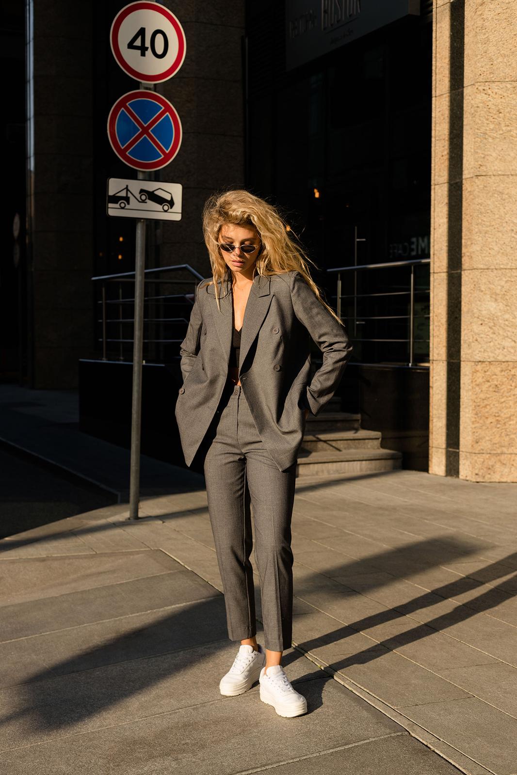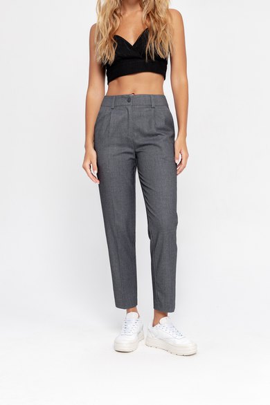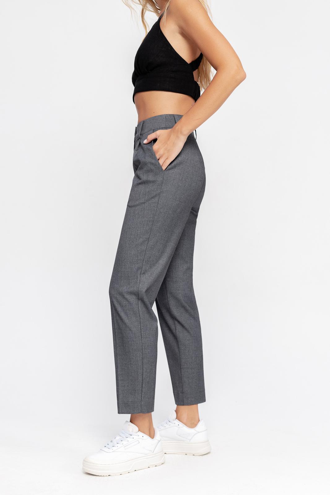 Классические укороченные брюки из текстильной ткани. Детали: брюки со средней посадкой, притачной пояс со шлевками, передние половины с небольшими мягкими складками и заутюженными стрелками, застежка на молнию и пуговицу, боковые карманы.