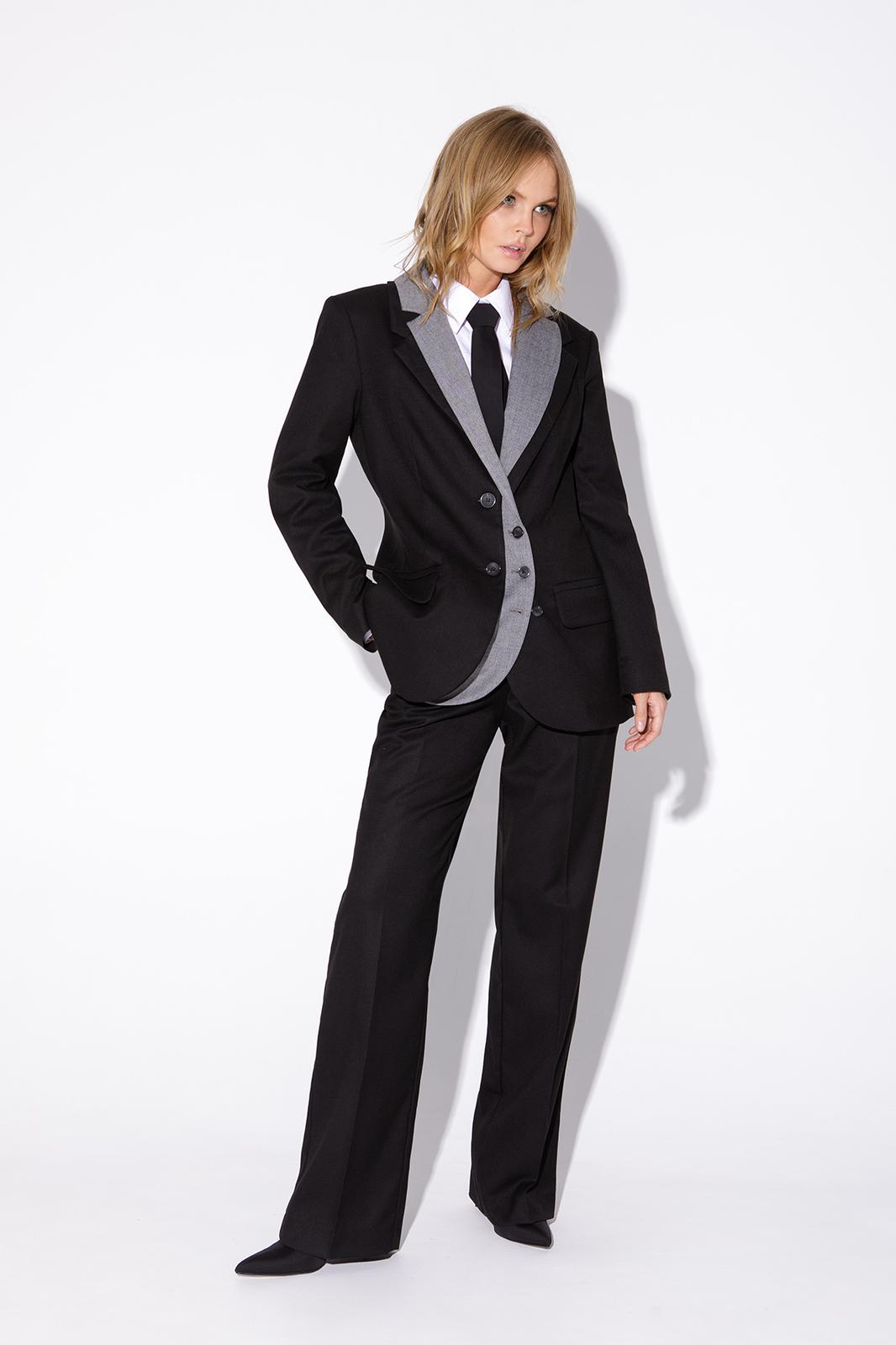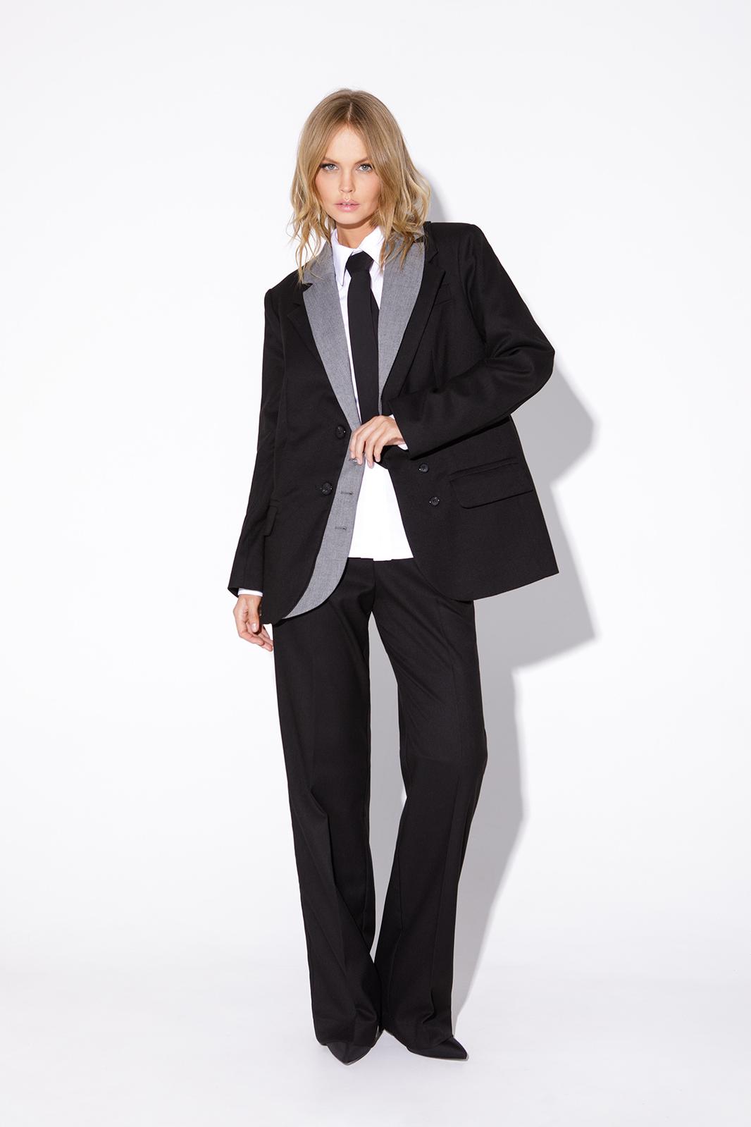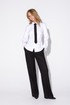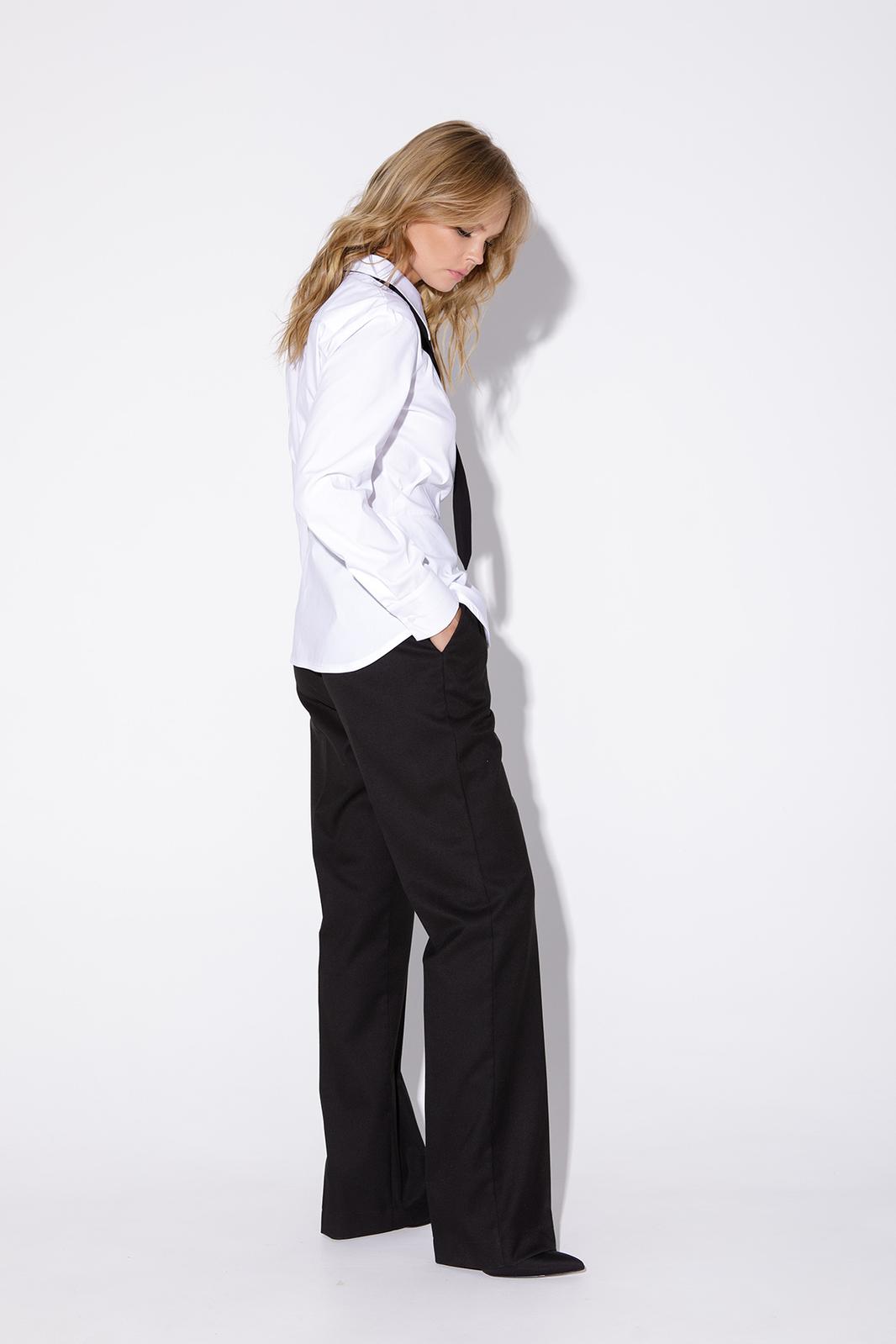 Классические прямые брюки из текстильной ткани. Детали: брюки с высокой посадкой, притачной пояс со шлевками, передние половины с небольшими мягкими складками и заутюженными стрелками, застежка на молнию и пуговицу, боковые карманы.