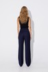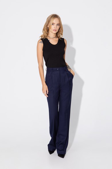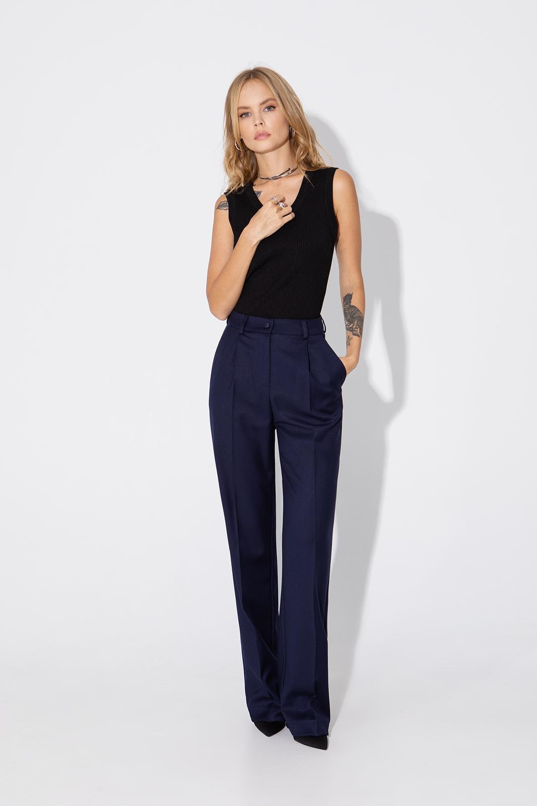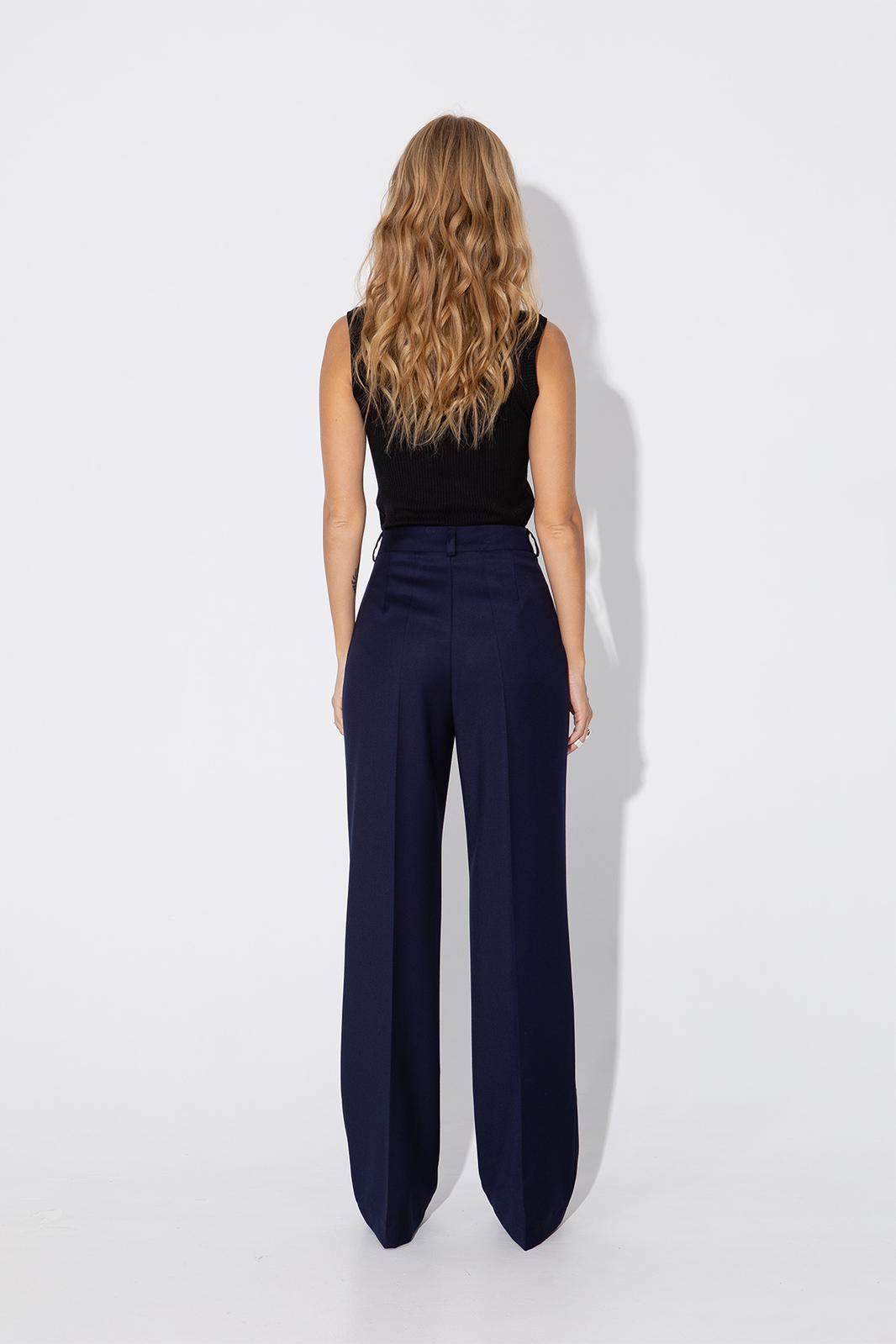 Текстильные брюки-палаццо с высокой посадкой. Детали: высокая посадка, широкие и длинные брюки, притачной пояс со шлевками, передние половины с небольшими застроченными мягкими складками и заутюженными стрелками, застежка на молнию и пуговицу, боковые карманы