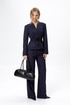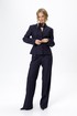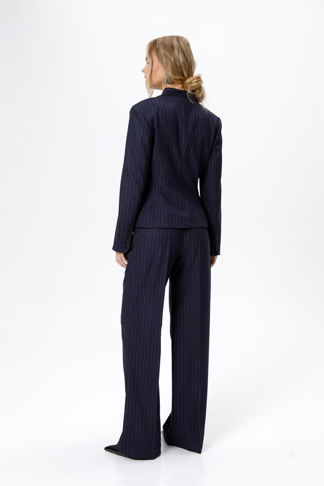 Детали: брюки с притачным поясом со шлевками, передние половины с небольшими застроченными мягкими складками и заутюженными стрелками, застежка на молнию и пуговицу, боковые карманы. Задние части брюк с вытачками и заутюженными стрелками. Пояс брюк прямой, без резинки.
