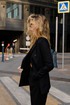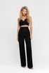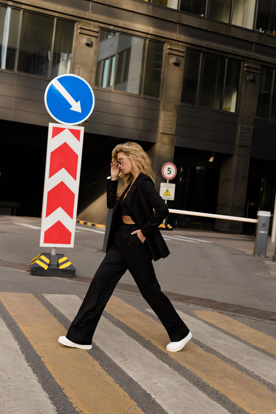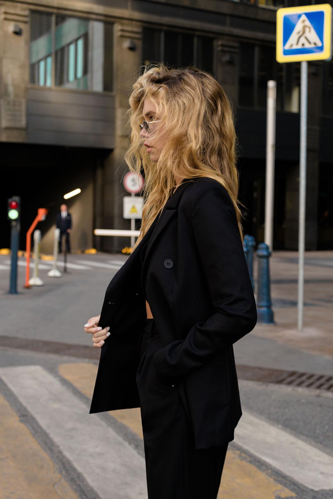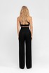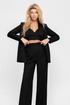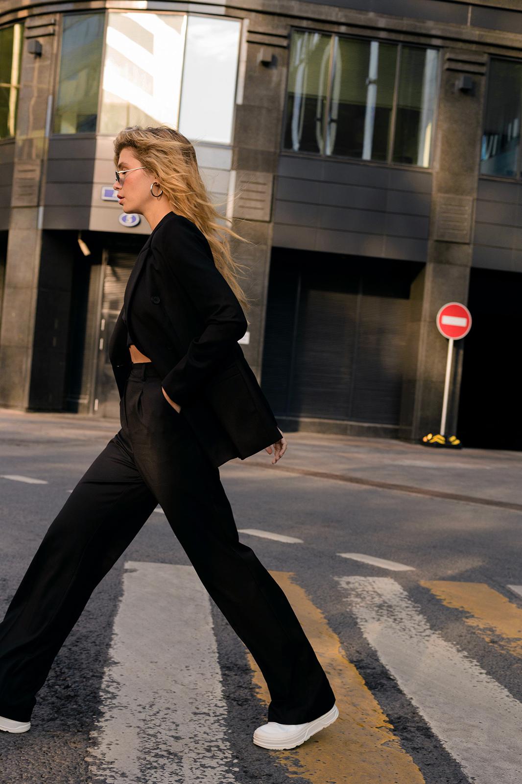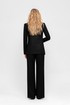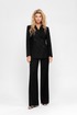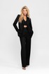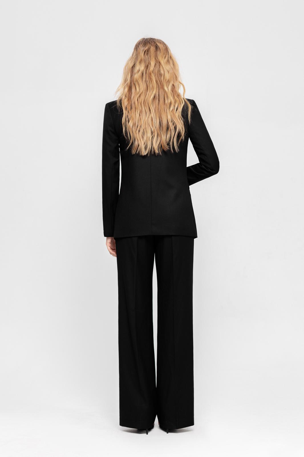 Текстильный костюм-двойка из классического двубортного жакета и брюк-палаццо Детали: жакет прямого силуэта, пиджачный воротник, перед с прорезными карманами, двубортная застежка на петли и пуговицы, спинка со средним швом, рукава втачные двухшовные, жакет на подкладке. Брюки с высокой посадкой на притачном поясе со шлевками, застежка на молнию и пуговицу, боковые карманы, передние половины с заутюженными стрелками и двумя небольшими складками