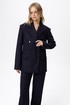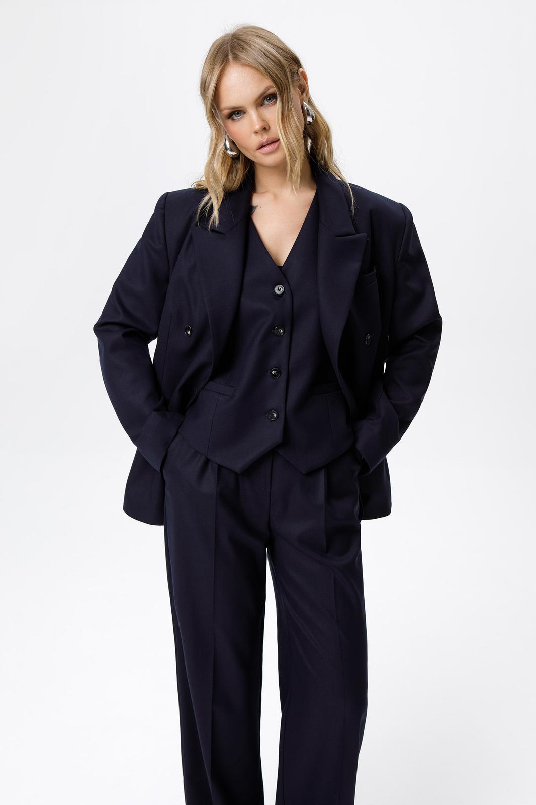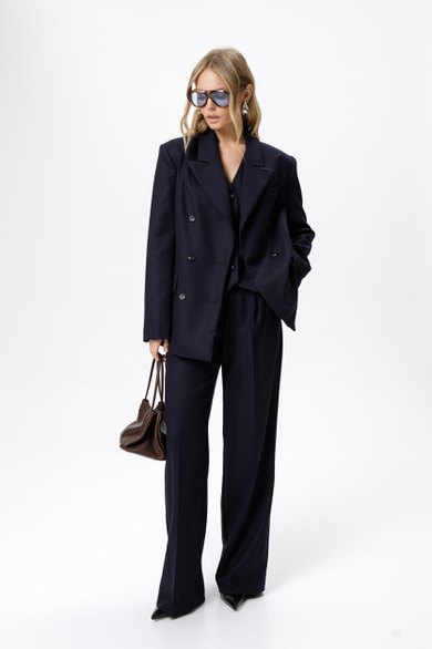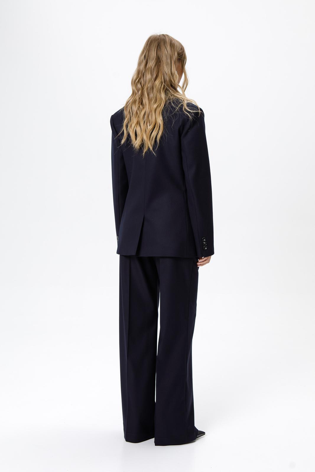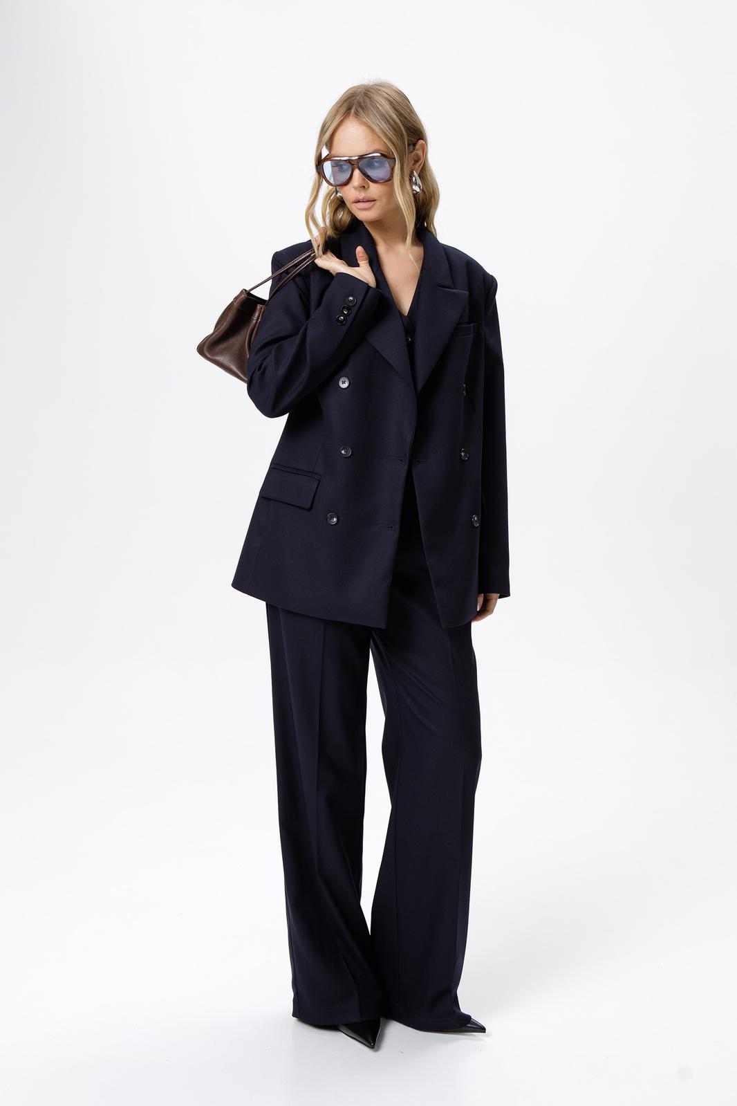 Детали: жакет свободного покроя и полуприлегающего силуэта, двубортная застежка на петли и пуговицы, отрезные бочки, пиджачный воротник, функциональные карманы, жакет на подкладке. Брюки с высокой посадкой, притачной пояс со шлевками, передние половины с небольшими застроченными мягкими складками и заутюженными стрелками, застежка на молнию и пуговицу, боковые карманы. Задние части брюк с вытачками и заутюженными стрелками. Пояс брюк прямой, без резинки.