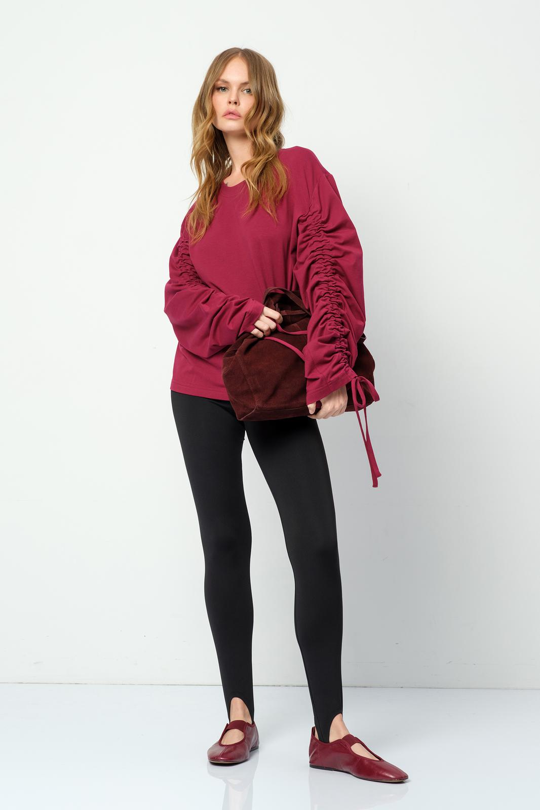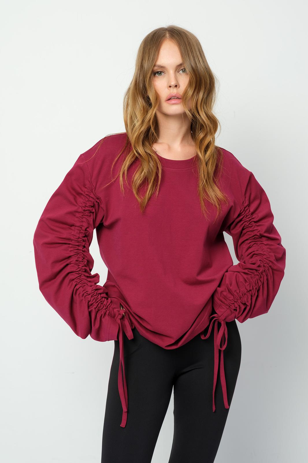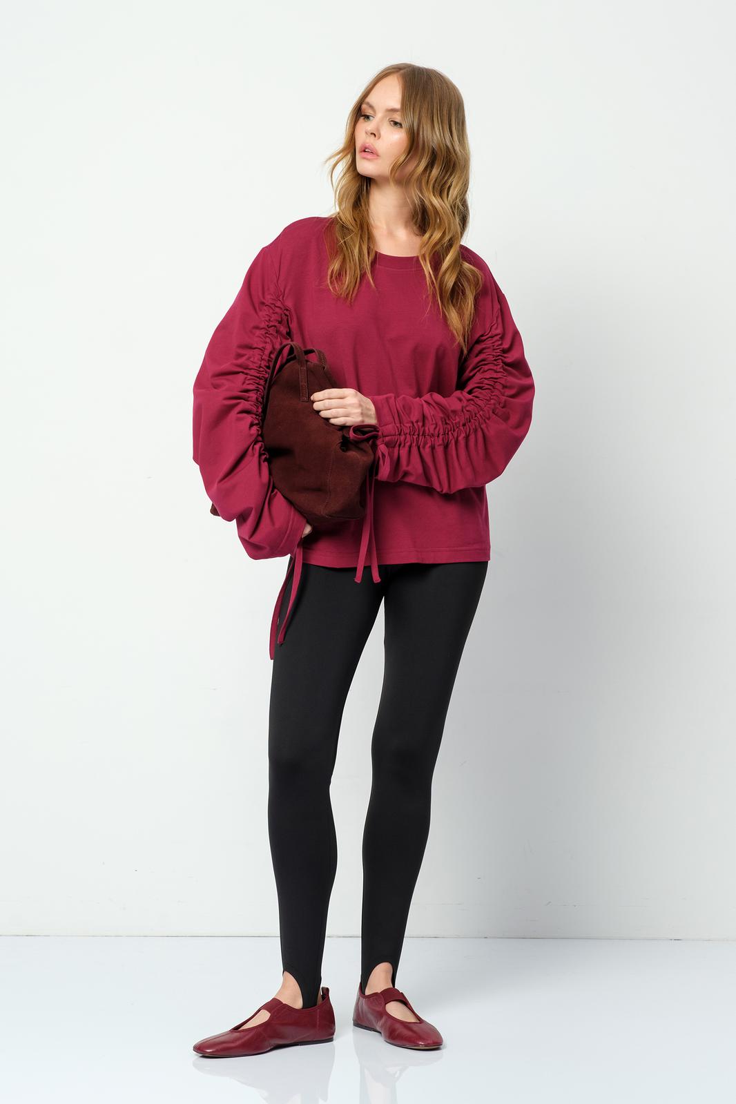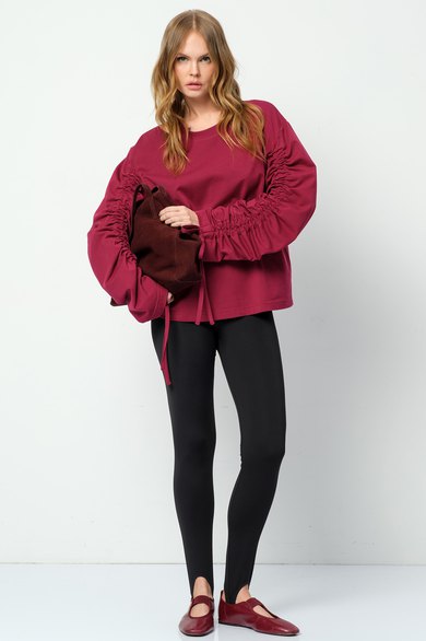Детали: свитшот прямого силуэта, круглая горловина, рукава втачные со сборкой и завязками, при помощи завязок и можно регулировать длину рукава. Плотнооблегающие леггинсы с высокой посадкой, эластичный пояс с резинкой, без карманов и застежки.