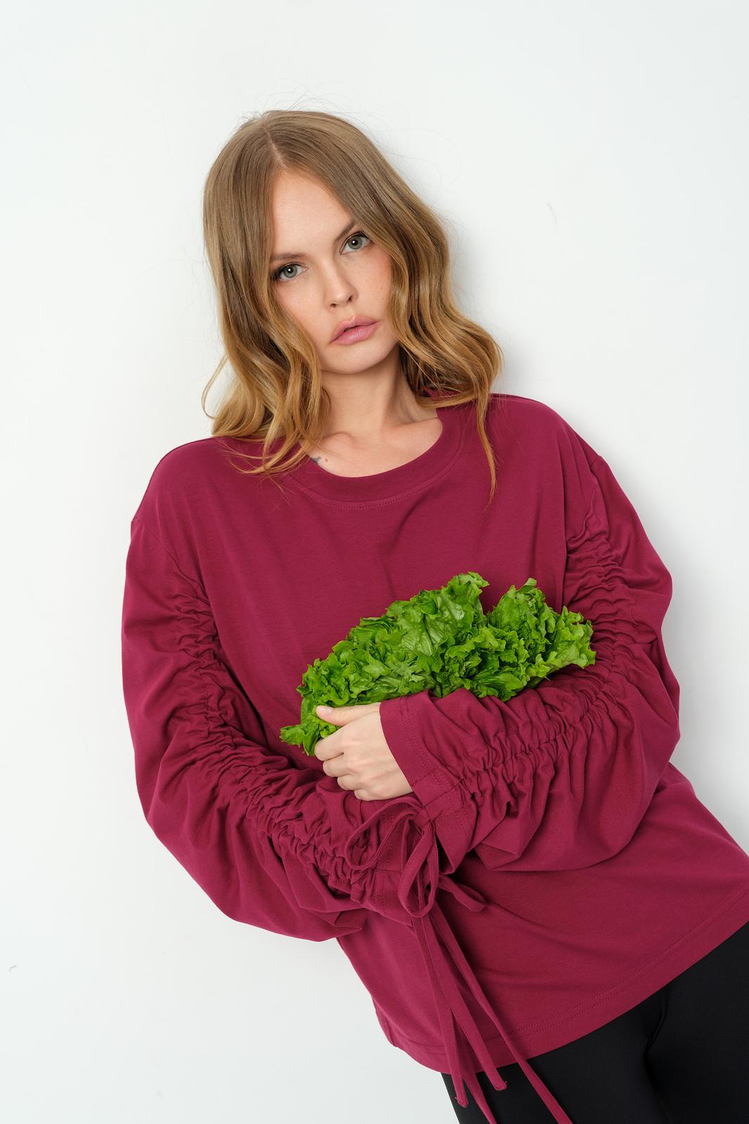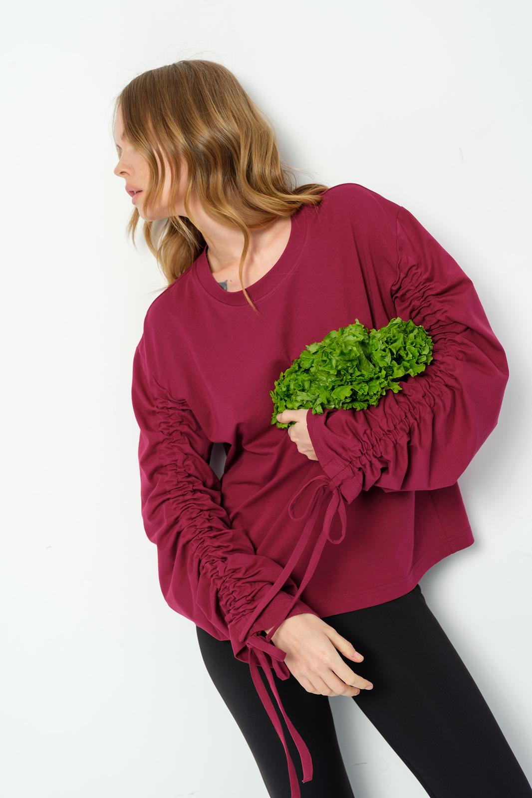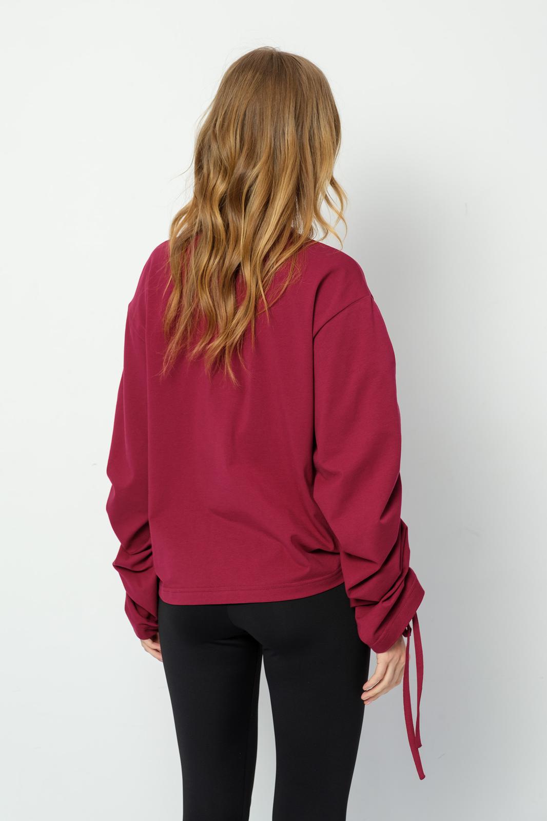 Детали: свитшот прямого силуэта, круглая горловина, рукава втачные со сборкой и завязками, при помощи завязок и можно регулировать длину рукава. Плотнооблегающие леггинсы с высокой посадкой, эластичный пояс с резинкой, без карманов и застежки.