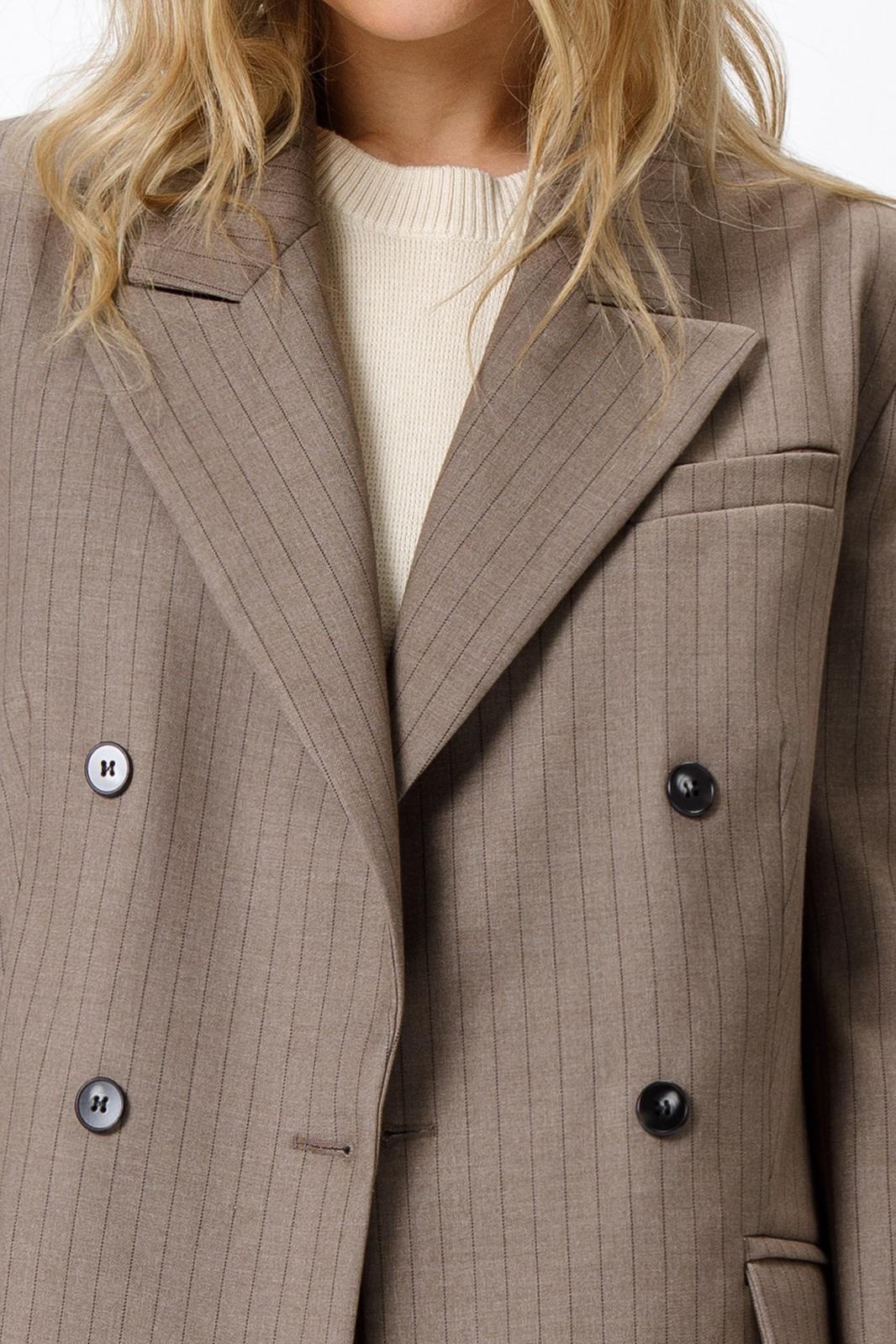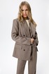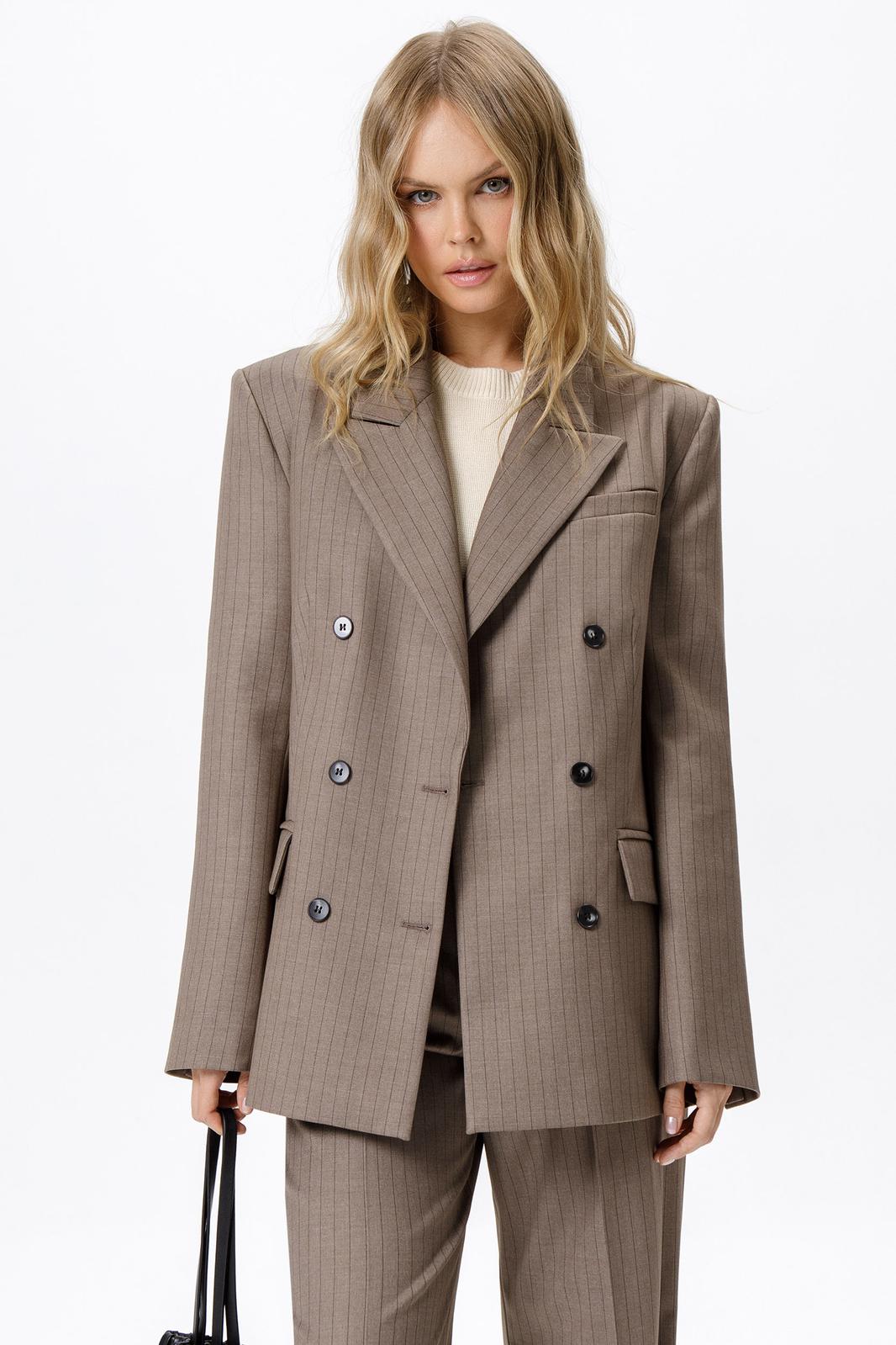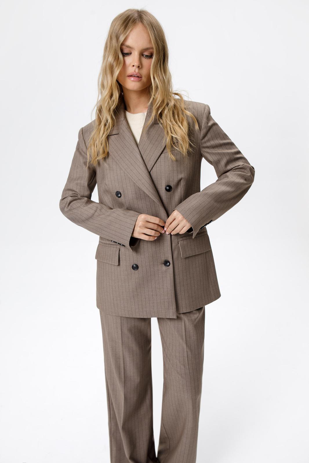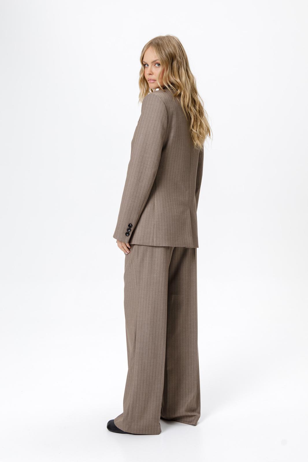 Детали: жакет свободного покроя и полуприлегающего силуэта, двубортная застежка на петли и пуговицы, отрезные бочки, пиджачный воротник, функциональные карманы, жакет на подкладке. Жилет полуприлегающего силуэта, талиевые вытачки, застежка на петли и пуговицы, функциональные карманы, фигурный низ, на подкладке. Брюки с высокой посадкой, притачной пояс со шлевками, передние половины с небольшими застроченными мягкими складками и заутюженными стрелками, застежка на молнию и пуговицу, боковые карманы. Задние части брюк с вытачками и заутюженными стрелками. Пояс брюк прямой, без резинки.