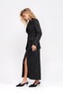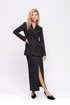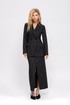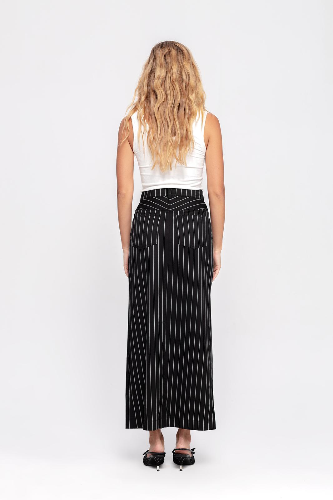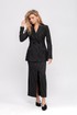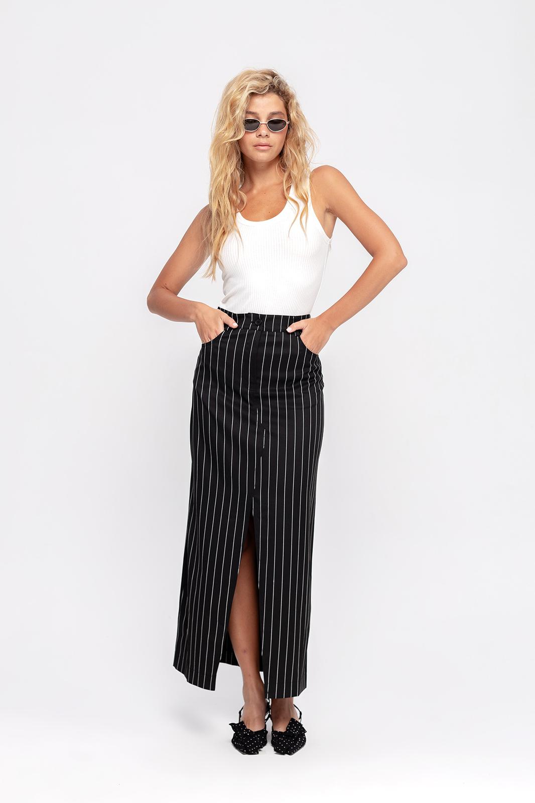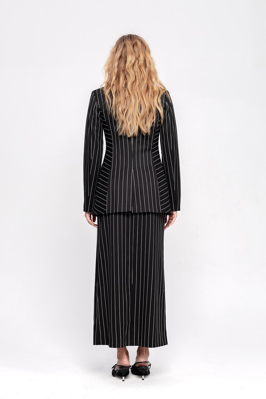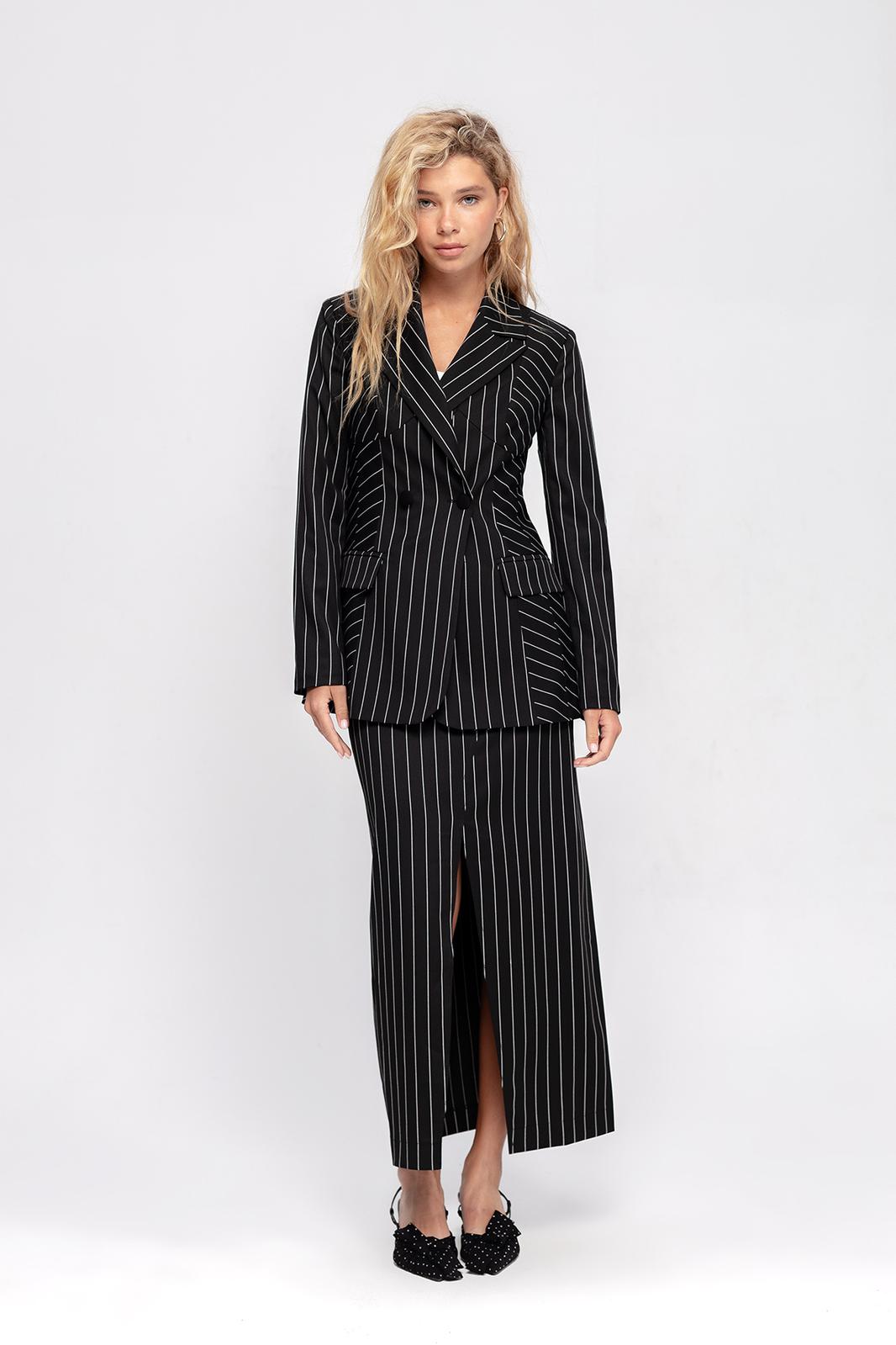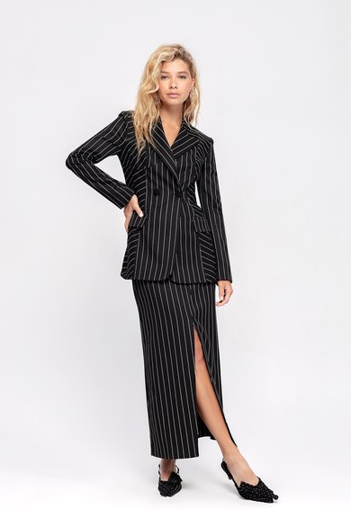 Костюм-двойка из приталенного жакета и макси-юбки из текстильной ткани в полоску Детали: жакет полуприлегающего силуэта, рельефные швы, пиджачный воротник, функциональные карманы, втачные длинные рукава, двубортная застежка на петли и пуговицы, спинка со шлицей, жакет на подкладке. Юбка с высокой посадкой на притачном поясе со шлевками, застежка на молнию и пуговицу, боковые карманы, высокий фигурный разрез