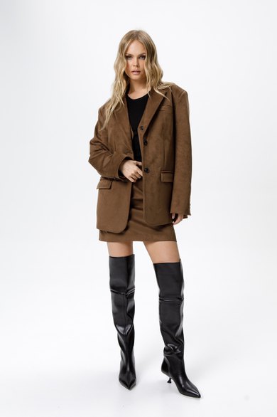 Костюм-двойка из оверсайз жакета и мини-юбки из ткани под замшу.