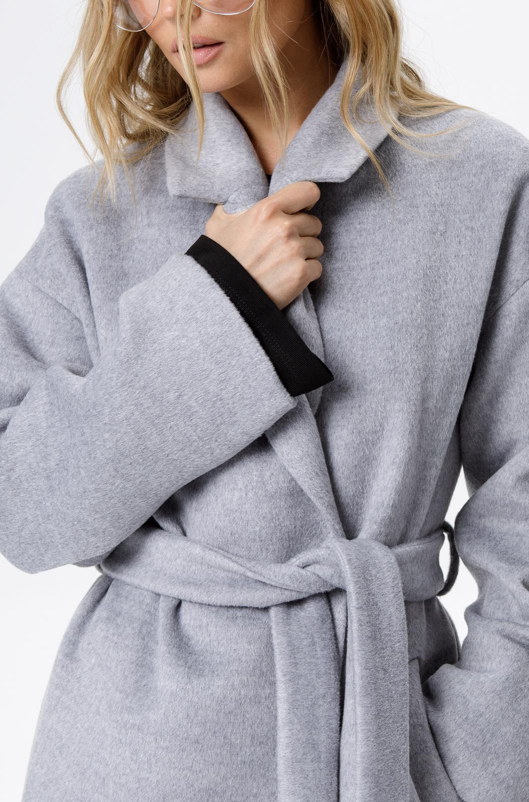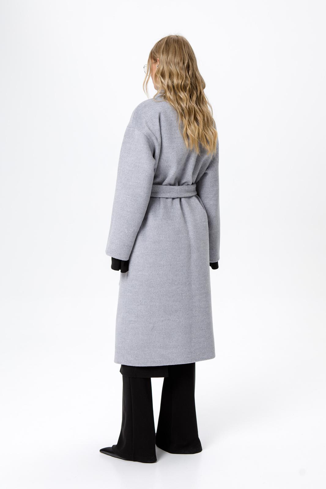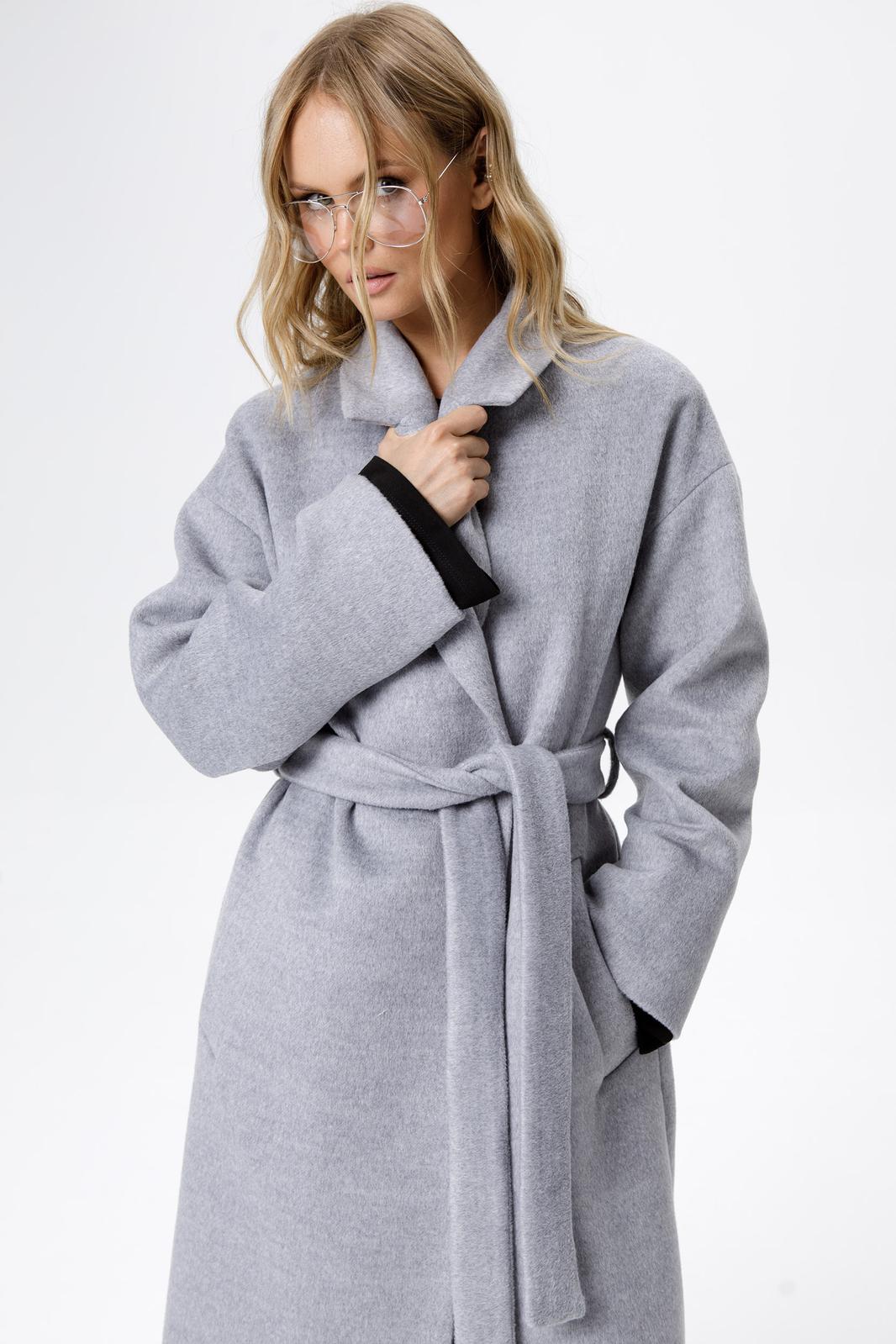 Детали: прямой силуэт, спущенная линия плеча, перед с прорезными карманами, пиджачный воротник, двубортная застежка на пришивные кнопки, рукава длинные, съемный пояс со шлевками, пальто на подкладке.