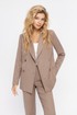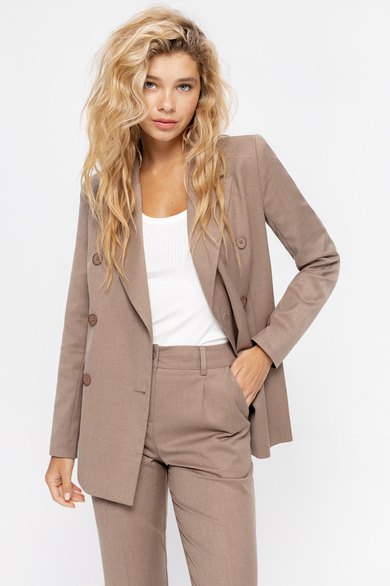 Текстильный классический жакет прямого кроя. Детали: жакет полуприлегающего силуэта, пиджачный воротник, перед с прорезными карманами, двубортная застежка на петли и пуговицы, спинка со средним швом, рукава втачные двухшовные, жакет на подкладке