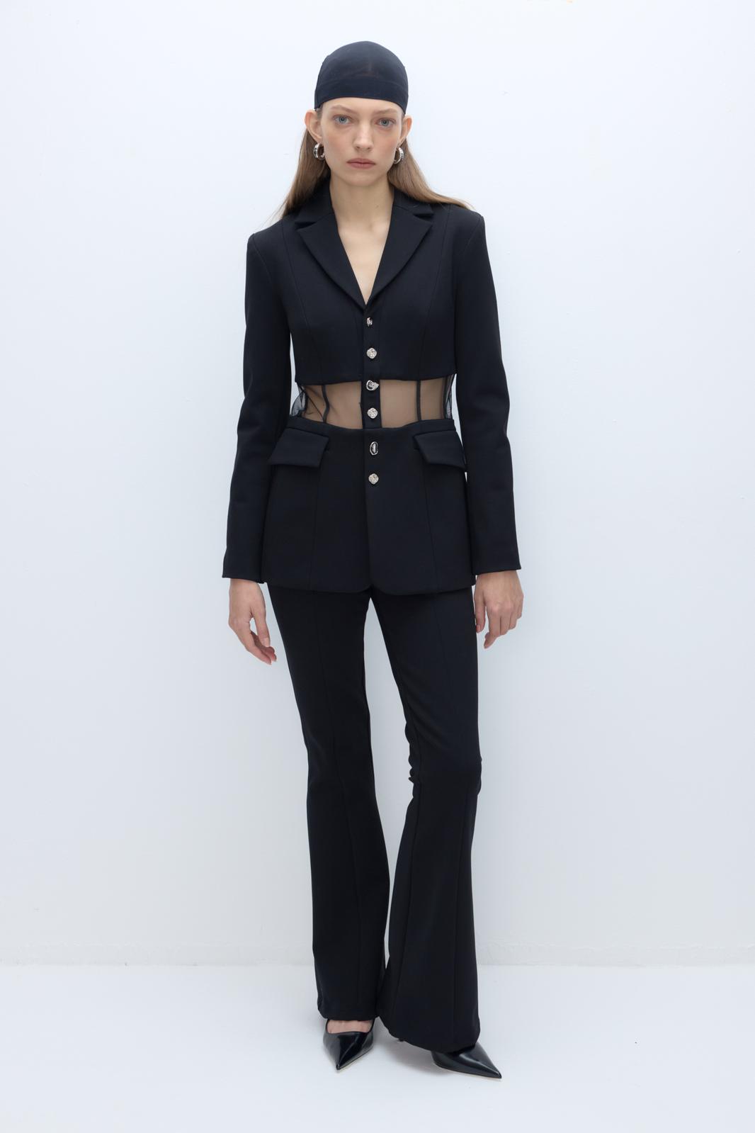 Жакет с прозрачной вставкой по талии и декоративными пуговицами.
