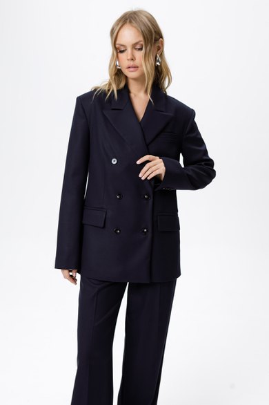 Детали: жакет свободного покроя и полуприлегающего силуэта, двубортная застежка на петли и пуговицы, отрезные бочки, пиджачный воротник, функциональные карманы, жакет на подкладке.