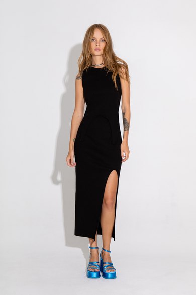 Облегающее трикотажное платье с высоким разрезом Детали: платье прилегающего силуэта, без застежки, плотный трикотаж в рубчик