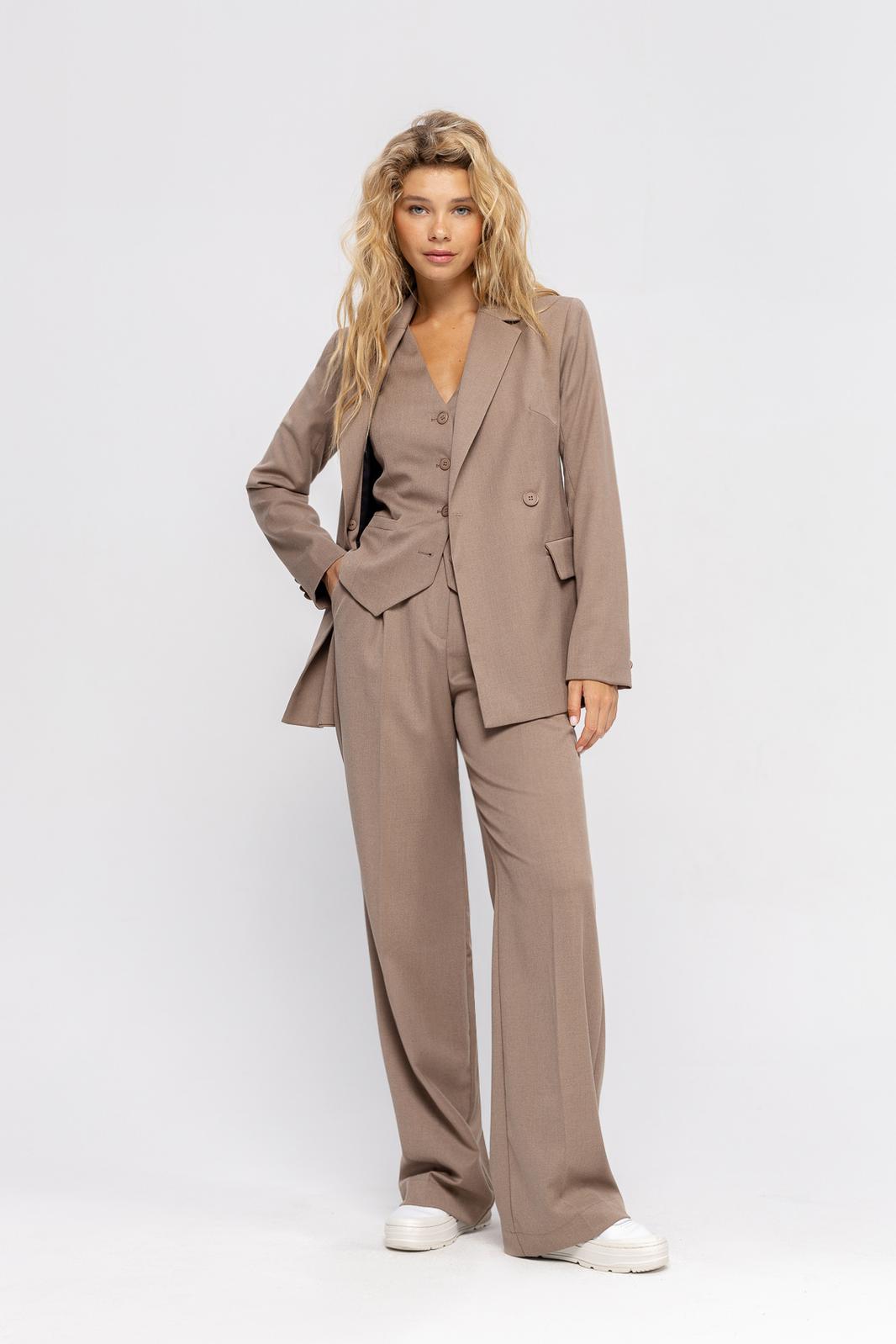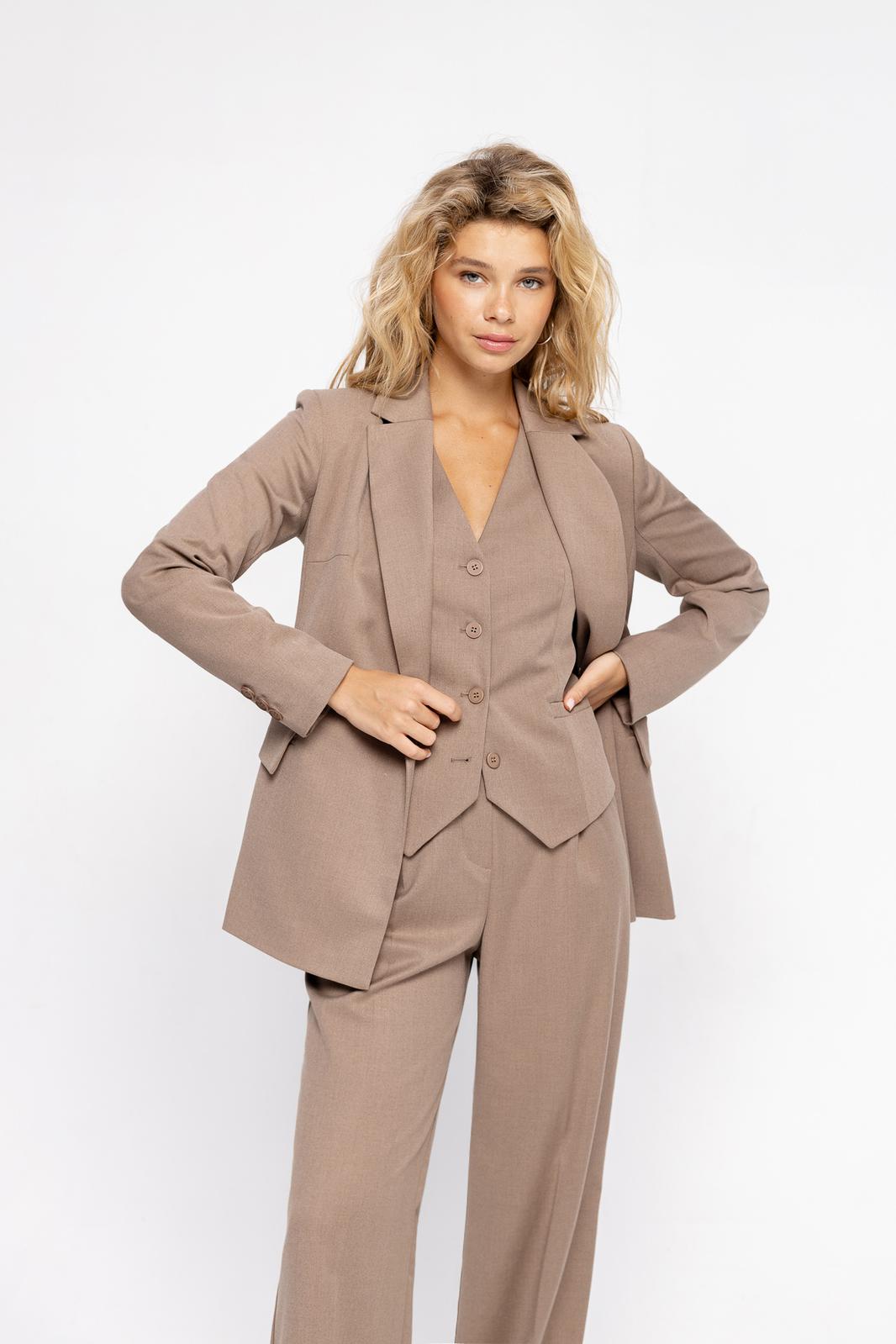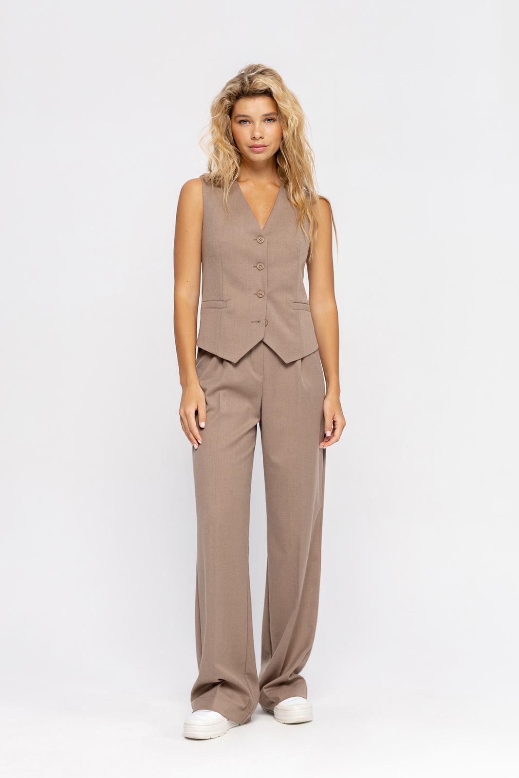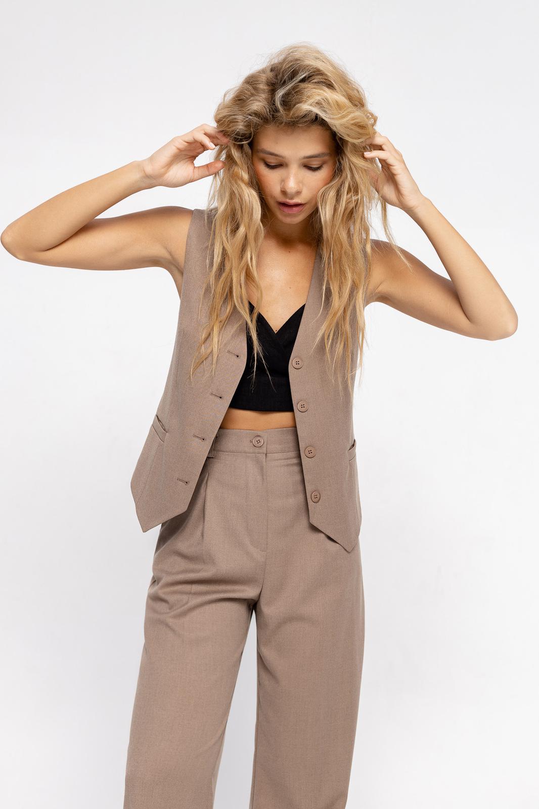 Классический жилет из текстильной ткани. Детали: жилет полуприлегающего силуэта с фигурным низом, застежка на петли и пуговицы, на подкладке