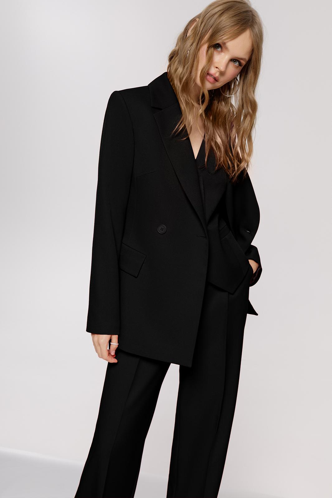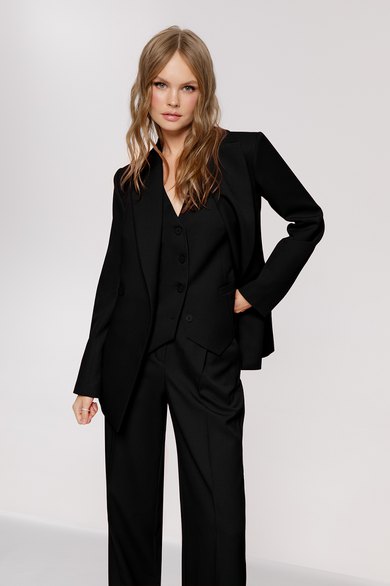 Классический жилет из текстильной ткани. Детали: жилет полуприлегающего силуэта с фигурным низом, застежка на петли и пуговицы, на подкладке