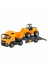 В одной упаковке — 2 игрушки! Это автомобиль-трейлер и трактор-погрузчик. Внешний вид техники приближен к дизайну прототипов. Автомобиль и трактор выполнены из прочного, качественного пластика. Автомобиль-трейлер предназначен для перевозки различной техники, а на платформу помещается трактор-погрузчик. Трейлер оснащён складным трапом. Трактор-погрузчик имеет подвижный ковш. С таким комплектом можно разыгрывать различные сценарии, а ребёнок больше узнает о большегрузной технике и её функционале.