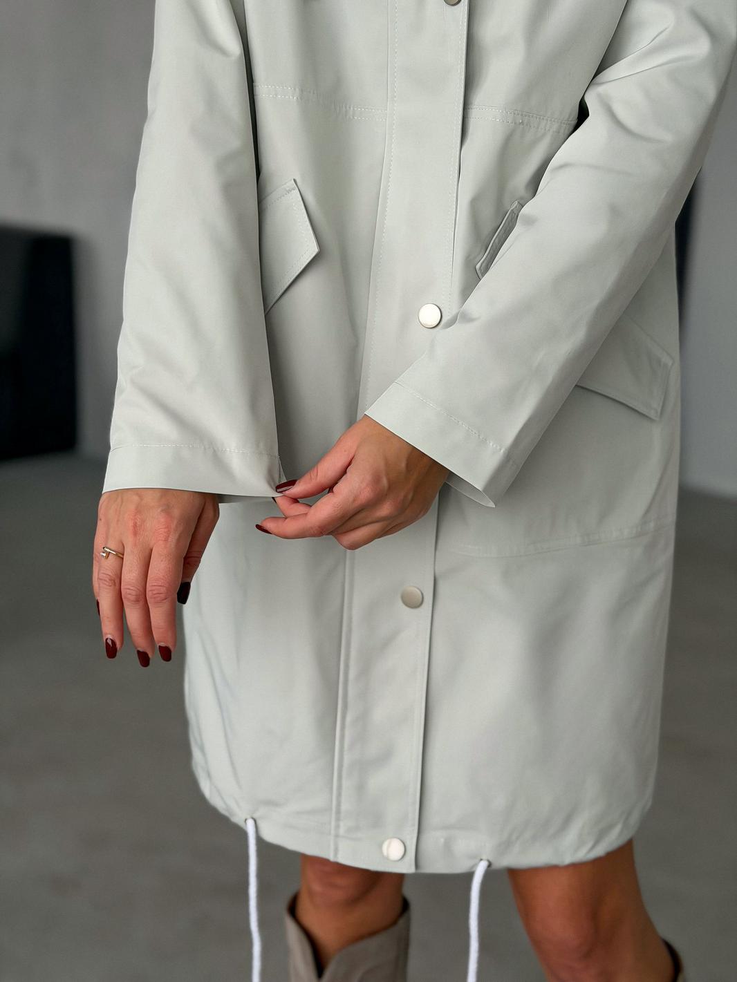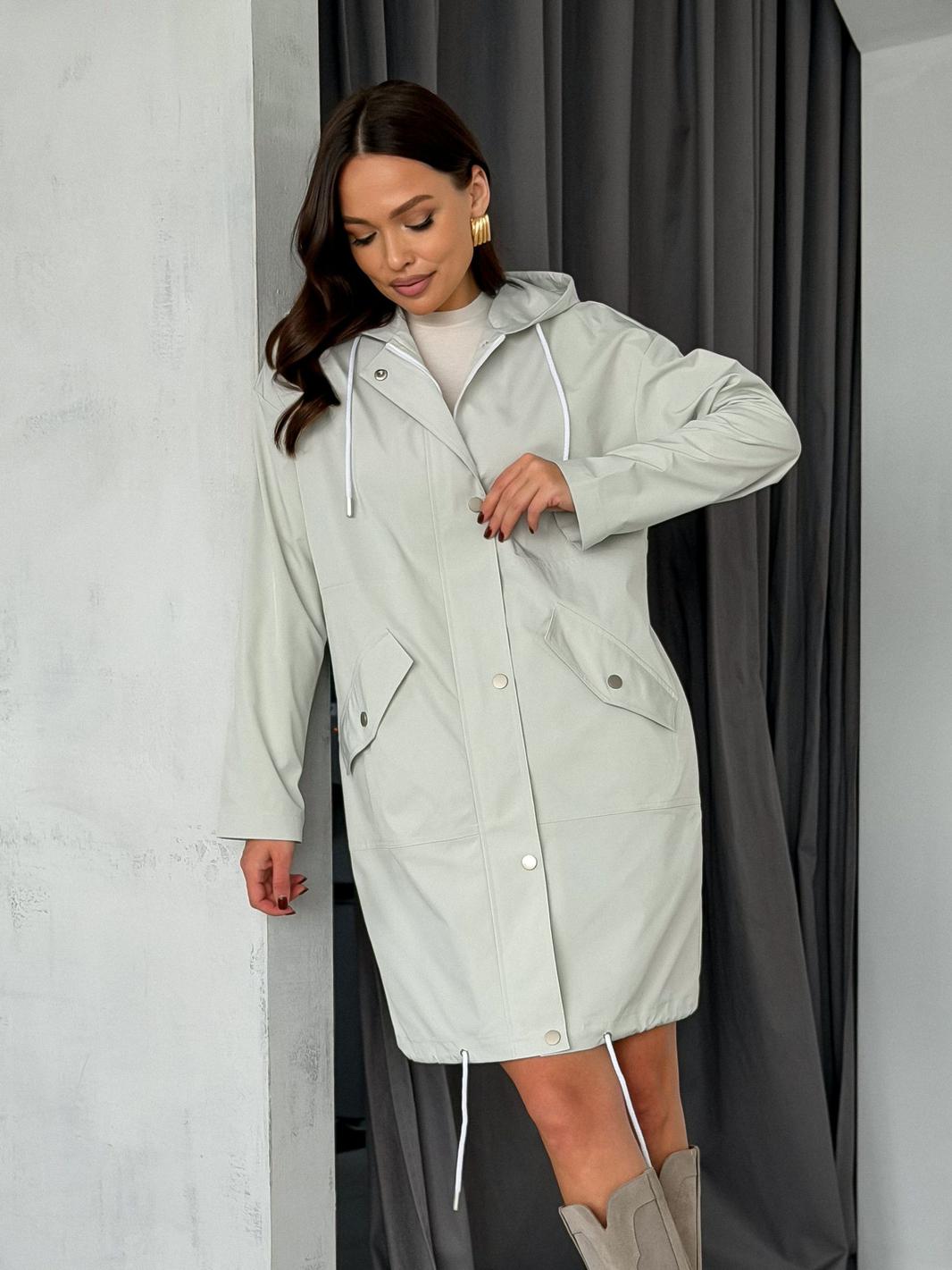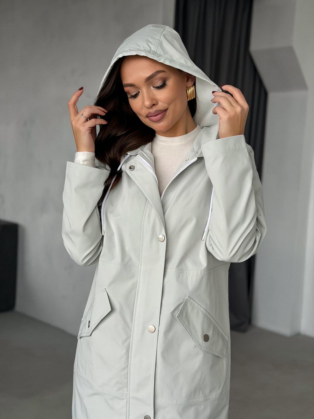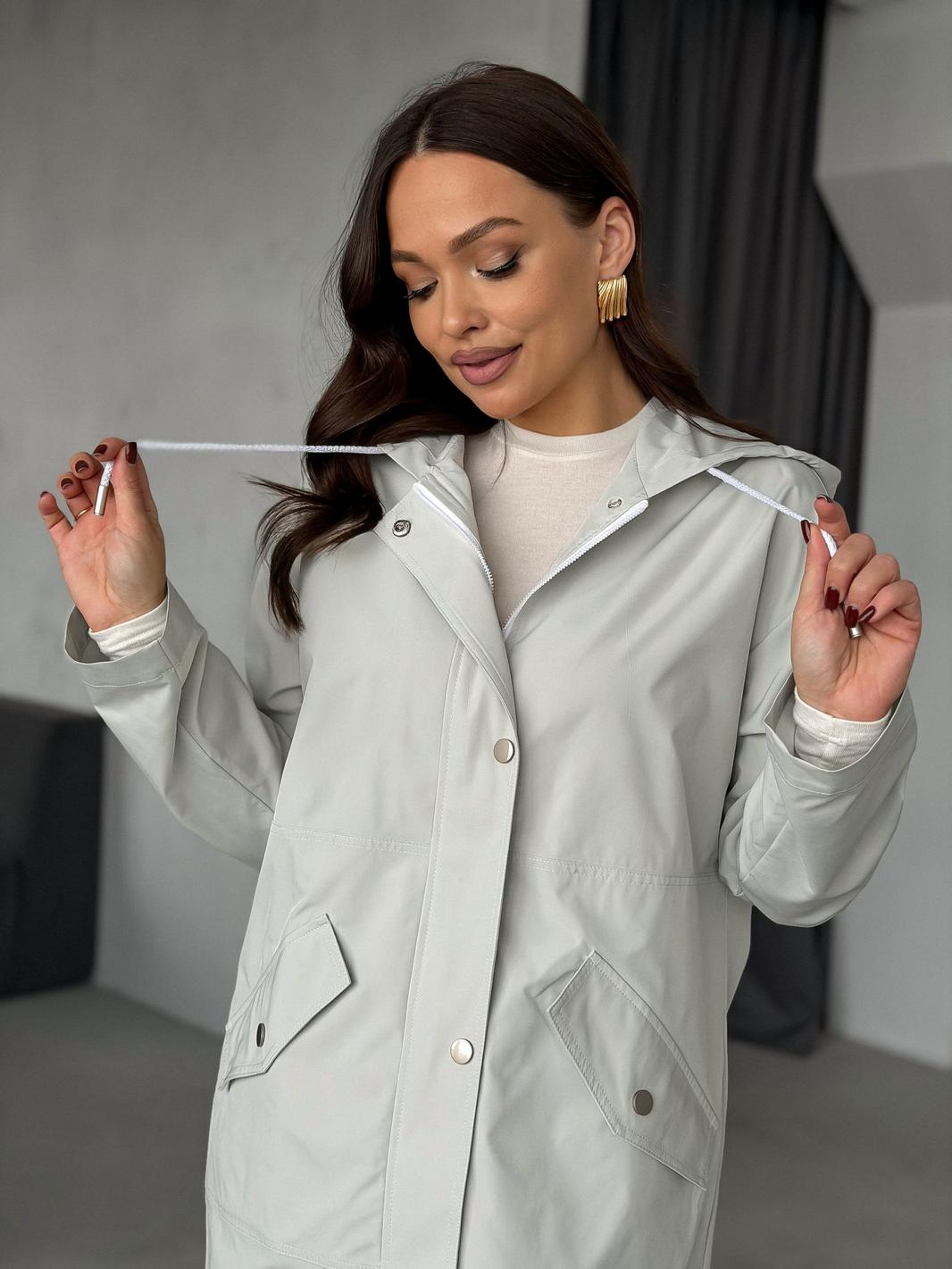 Куртка женская из текстильной ткани (водоотталкивающая) прямого силуэта. По переду расположены декоративные подрезы с прорезными карманами. Спинка состоит из 2-ух частей. На верхней части расположена кокетка и настрочной элемент. Нижняя часть со средним швом. Спущенное плечо, рукав прямой. Вырез горловины оформлен капюшоном с блочками и шнуром. Куртка с планкой, застегивается на молнию и кнопки. По низу изделия расположен шнур с наконечниками.