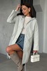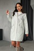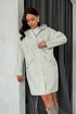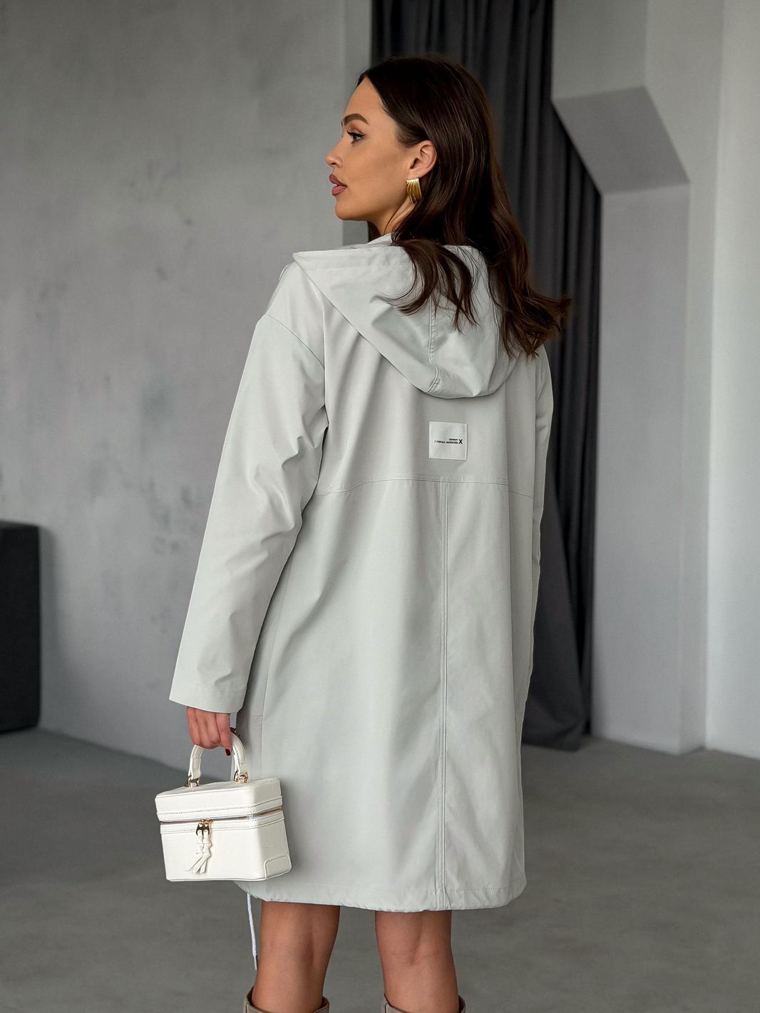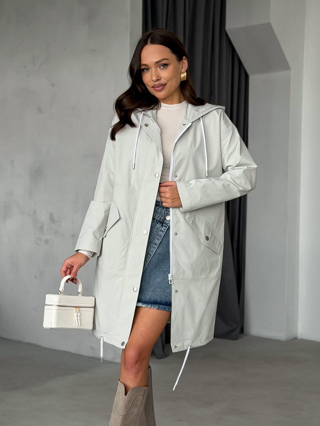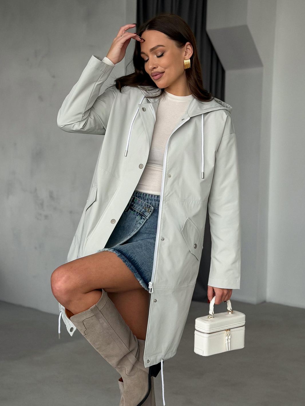 Куртка женская из текстильной ткани (водоотталкивающая) прямого силуэта. По переду расположены декоративные подрезы с прорезными карманами. Спинка состоит из 2-ух частей. На верхней части расположена кокетка и настрочной элемент. Нижняя часть со средним швом. Спущенное плечо, рукав прямой. Вырез горловины оформлен капюшоном с блочками и шнуром. Куртка с планкой, застегивается на молнию и кнопки. По низу изделия расположен шнур с наконечниками.