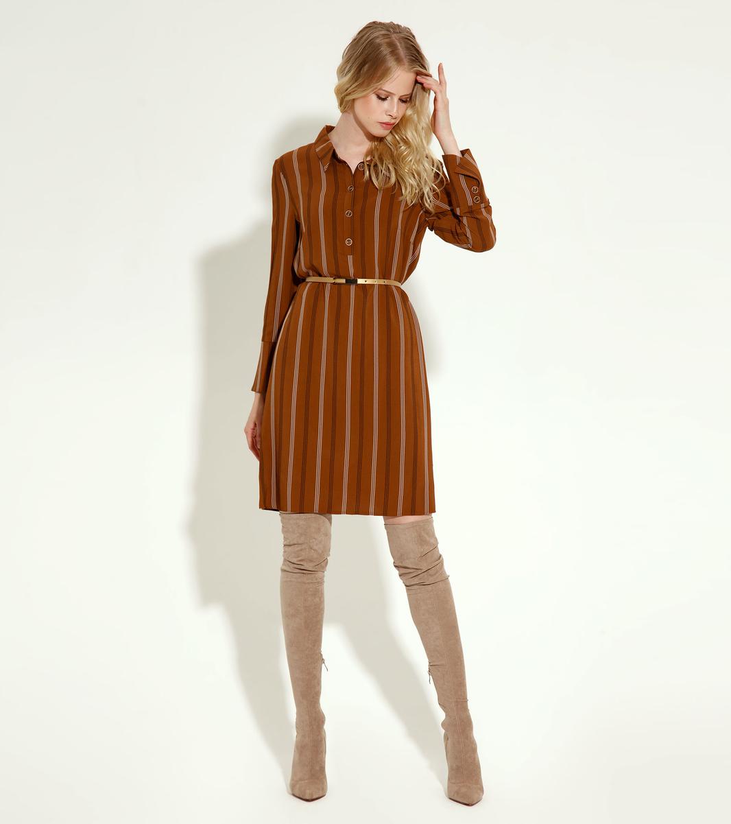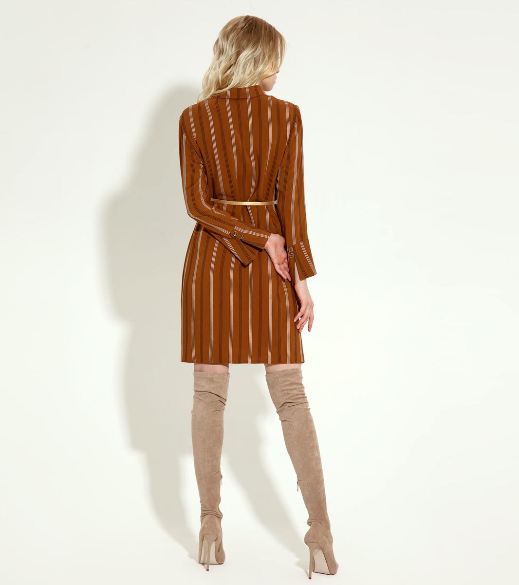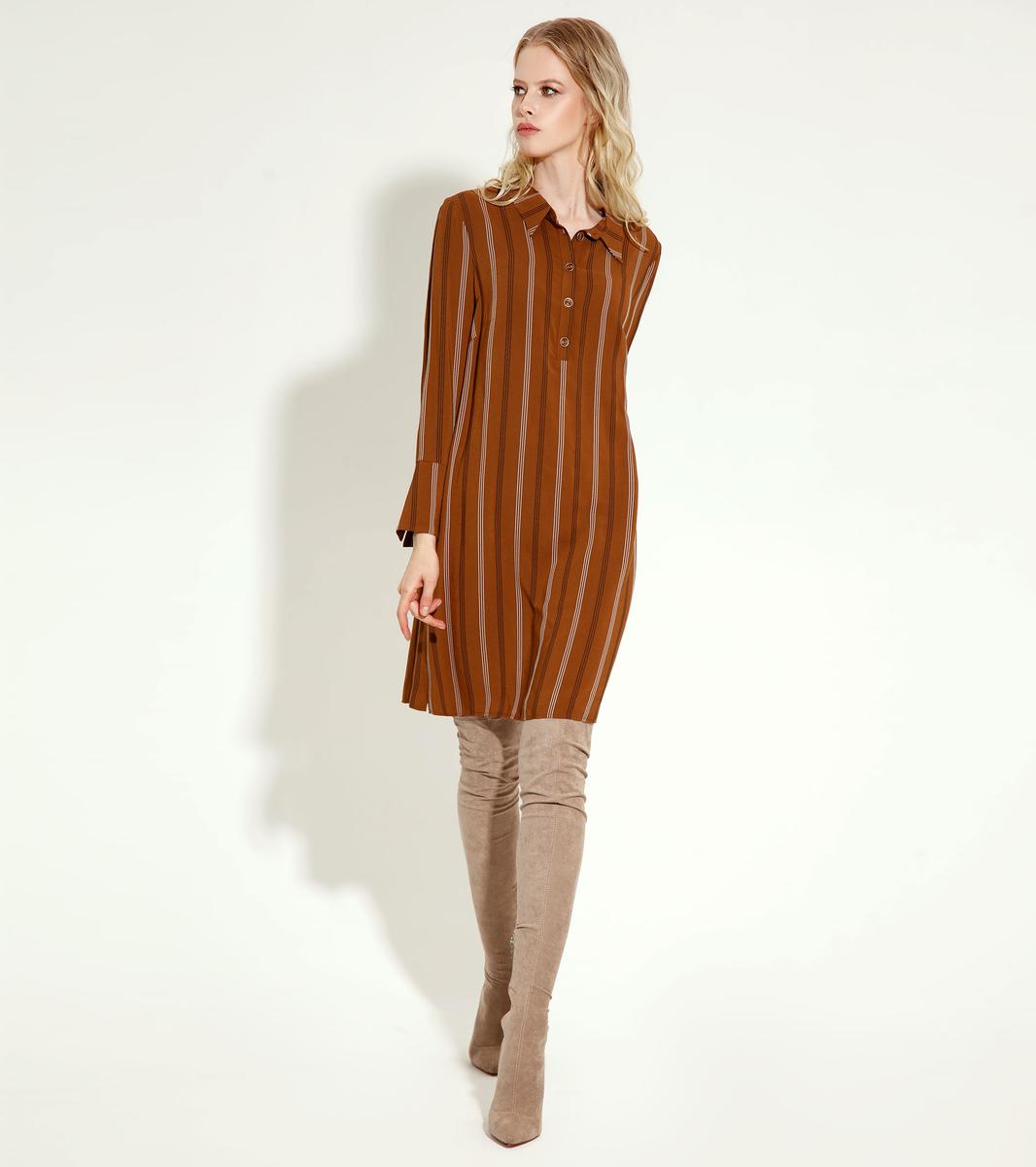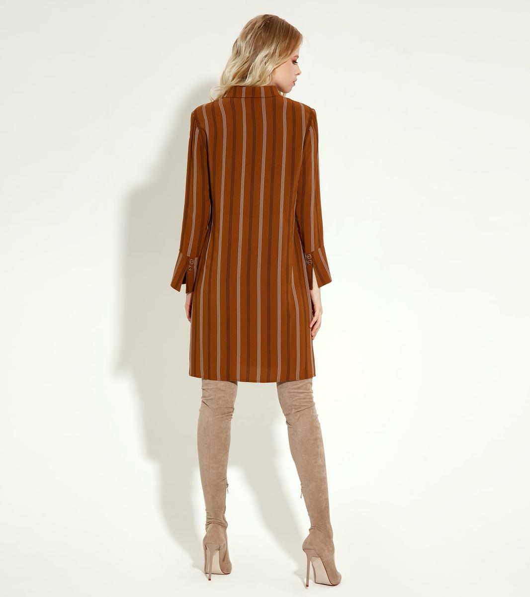 Эффектное платье из струящейся ткани,принт в полоску, полуприлегающего силуэта, слегка расширенное к низу, с наргудными вытачками, с воротником и планкой от него на петли пуговицы. Спинка с плечевыми вытачками. Рукава 7/8, с широкими манжетами. Шикарный образ, как по случаю так и без него, нет никаких сомнений в том , что обладательница этого платья, будет выглядеть безупречно.