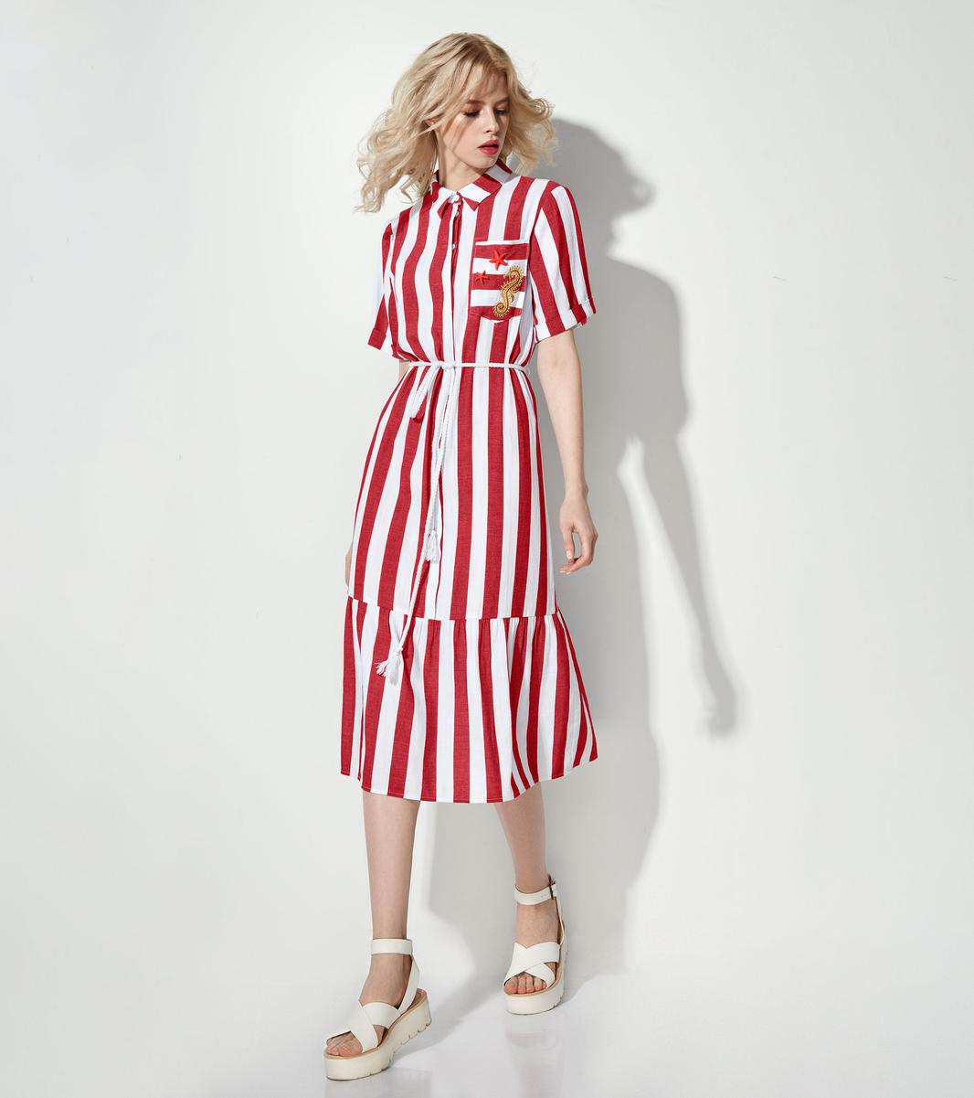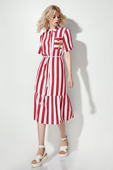 Платье женское прямого силуэта Рукав до локтя По переду застежка на петли-пуговицы Имеется накладной карман с декором По низу платья волан Пояс в виде каната
