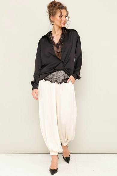 Брюки алладины, выполнен из струящейся ткани с матовым блеском. Брюки свободного силуэта с боковыми наклонными карманами. Притачной пояс и манжеты на резинке.