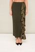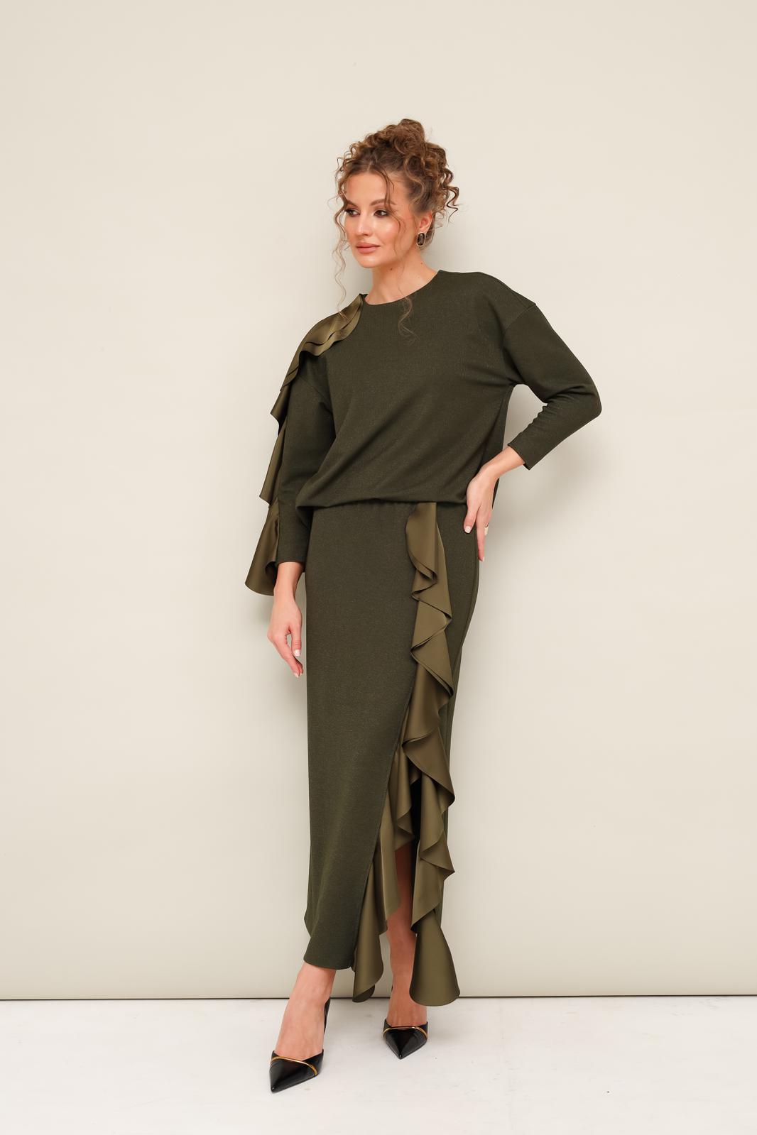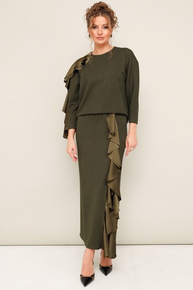 Комплект декорирован двойным сатиновым воланом по плечевому шву, рукаву и по вертикальному подрезу в юбке.
