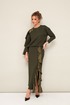 Элегантный трикотажный комплект, состоящий из джемпера и юбки. Джемпер прямого силуэта со спущенной линией втачивания плеча, рукава в длине 7/8. По спинке разрез с застежкой на пуговицу и навесную петлю. Юбка в длине миди с притачным поясом на резинке. Спереди обработан высокий разрез.