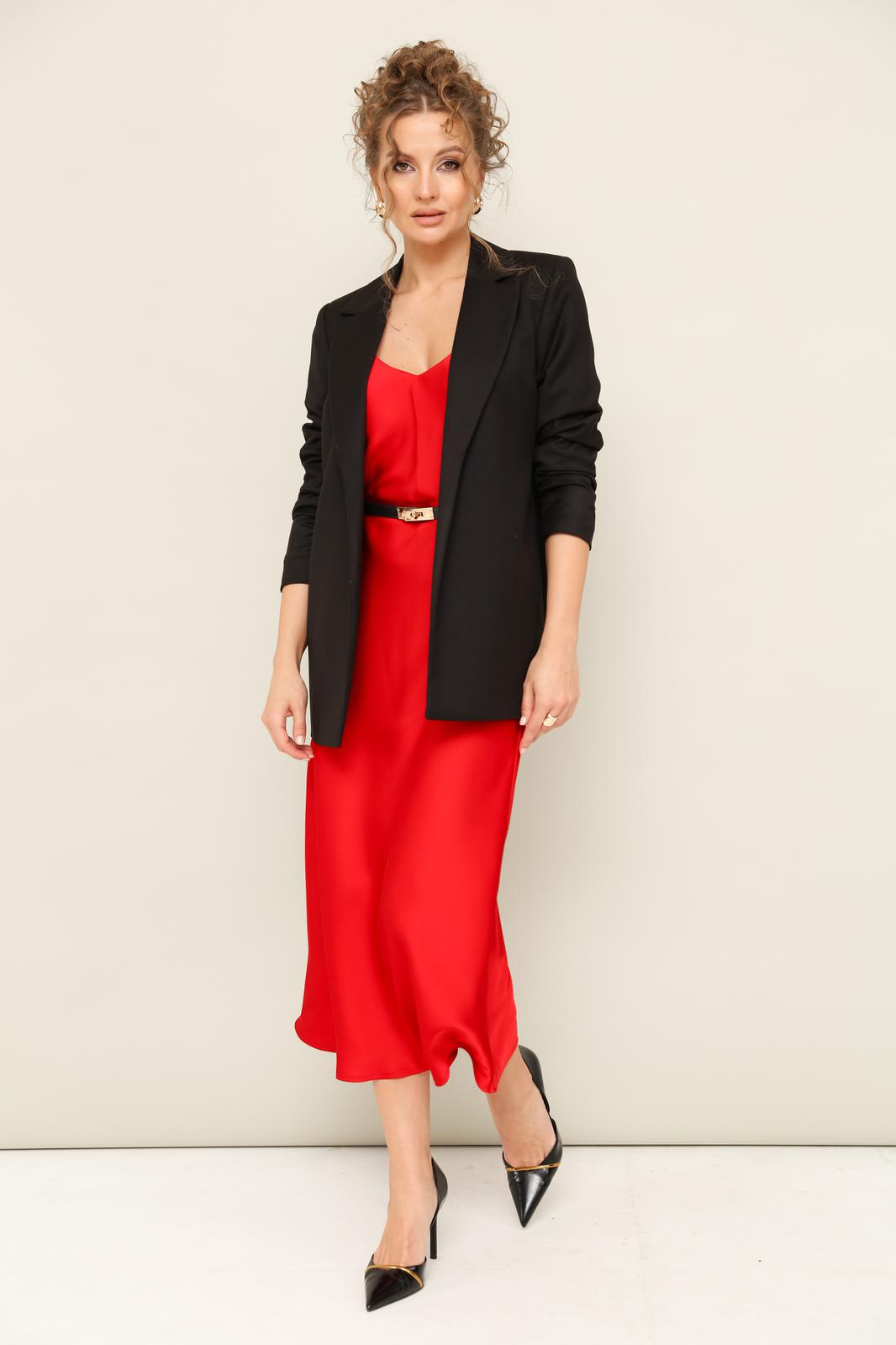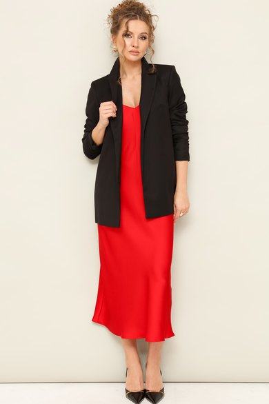 Комплект состоит из жакета и платья.Платье-комбинация полуприлегающего силуэта, на регулируемых бретелях.Жакет прямого кроя.Ремень в комплекте. Ог 92/96/100/104 см.Жакет:71 см длина,рукав 59 см.Платье:105 см длина ,ог 88/92/96/100.Об 96/100/104/108 см.