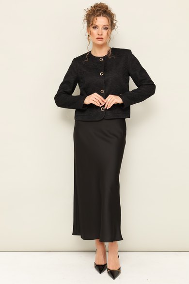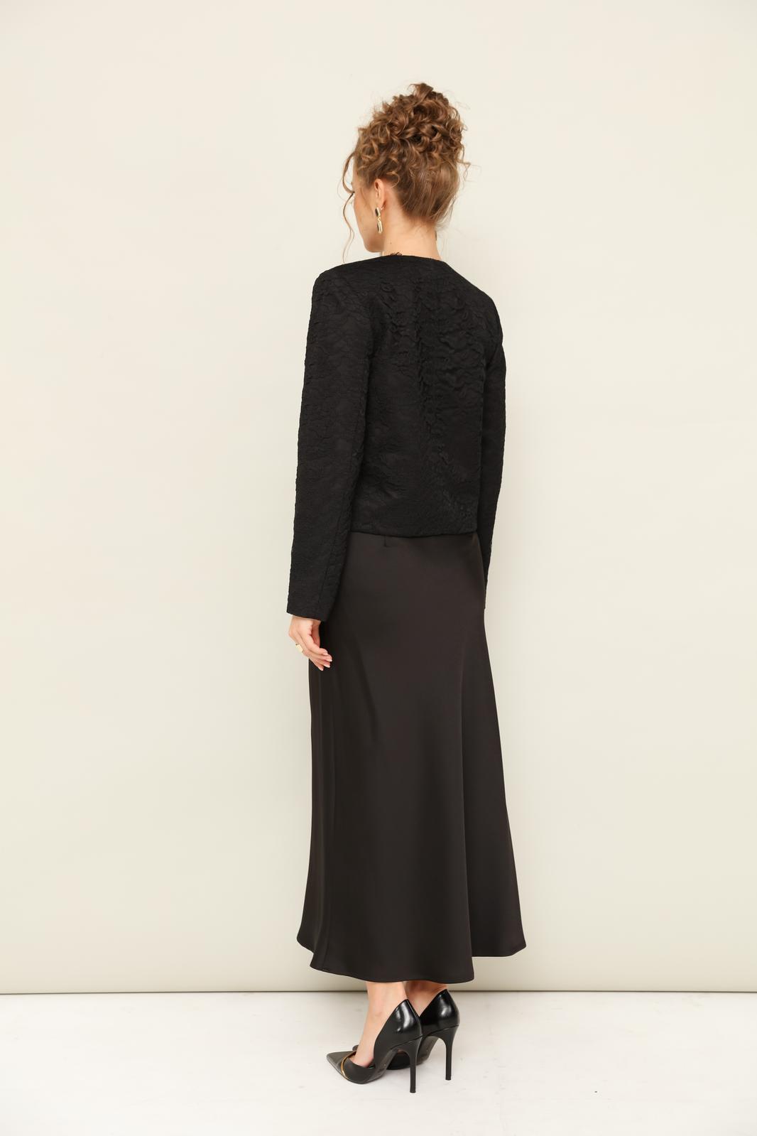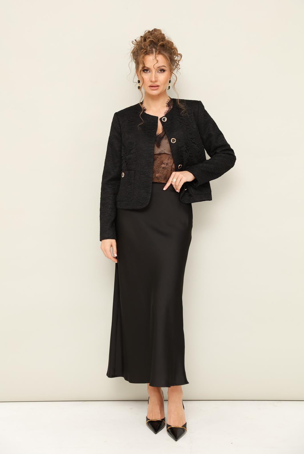 и юбки.Жакет укороченный,застегивается на пуговицы, выполнен из двух тканей: ажурное кружево и сатин. Юбка полуприлегающего силуэта,застегивается на потайную молнию сбоку,выполнена из великолепного гладкого сатина.