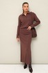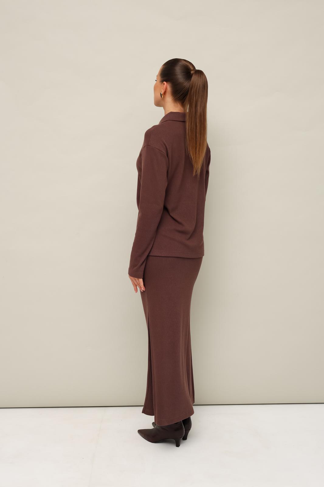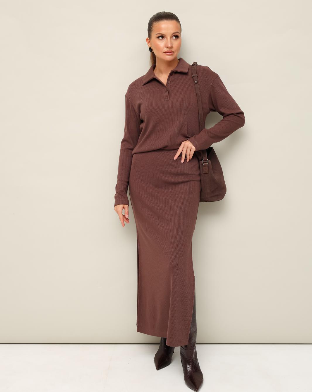 Комфортный трикотажный комплект, состоящий из поло и юбки. Поло с отложным воротником с цельнокроеной стойкой. Вырез горловины обработан притачными планками с застежкой на петли и пуговицы. Спущенная линия втачивания рукава. Юбка прямого кроя, пояс на резинке, в боковых швах обработаны высокие разрезы.