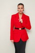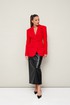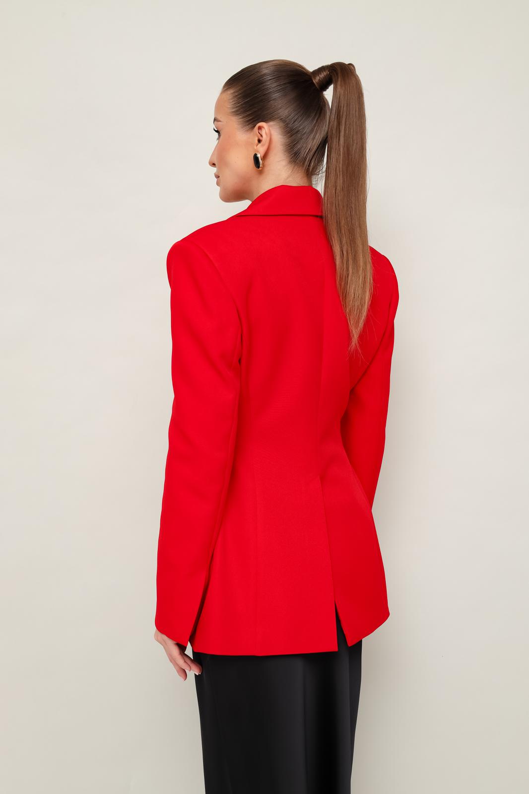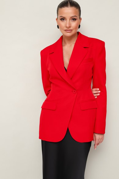 Силуэтный жакет с подчеркнутой линией талии. Смещенная застежка на петлю и пуговицу. Воротник пиджачного типа с отложными лацканами, край борта скругленный по низу жакета. Спереди обработаны прорезные карманы в рамку с клапанами и нагрудный прорезной карман с листочкой. Рукава втачные, двухшовные с отлетнымм шлицами. Спинка с рельефами и средним швом, переходящим в шлицу. Изделие на подкладке.