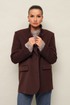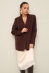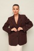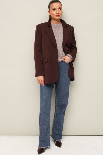 Жакет актуального прямого кроя, выполнен из костюмной ткани. Воротник пиджачного типа с отложными лацканами, край борта скругленный по низу жакета. Спереди обработаны прорезные карманы в рамку с клапанами. Рукава втачные двухшовные со шлицей и пуговицами. Спинка со средним швом, переходящим в высокую шлицу с застежкой на петли и пуговицы. Жакет на подкладке.