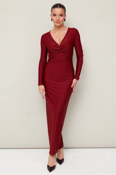 Платье прилегающего силуэта в длине миди. Горловина округлой формы с вырезом «капля». На лифе обработан декоративный узел с подрезом под линией груди. Рукава длинные втачные.