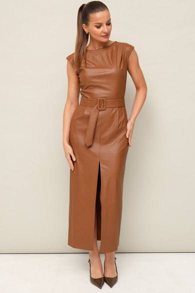 Стильное платье отрезное по линии талии в длине миди, выполнено из экокожи. Округлый вырез горловины. По плечевым швам лифа и по талии обработаны защипы. Юбка со средним швом, переходящим в разрез. Спинка в V-образным вырезом. В среднем шве застёжка на потайную тесьму молнию. В комплекте прилагается пояс из основной ткани с обтяжной пряжкой.
