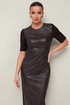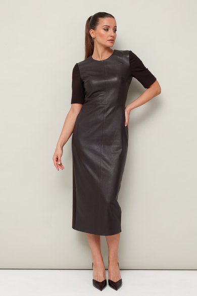 Стильное платье-футляр отрезное по линии талии, выполнено из экокожи и трикотажного полотна. Горловина округлой формы. Короткие втачные рукава. Застёжка по спинке в среднем шве на потайную молнию. Для удобства движения сзади обработан разрез.