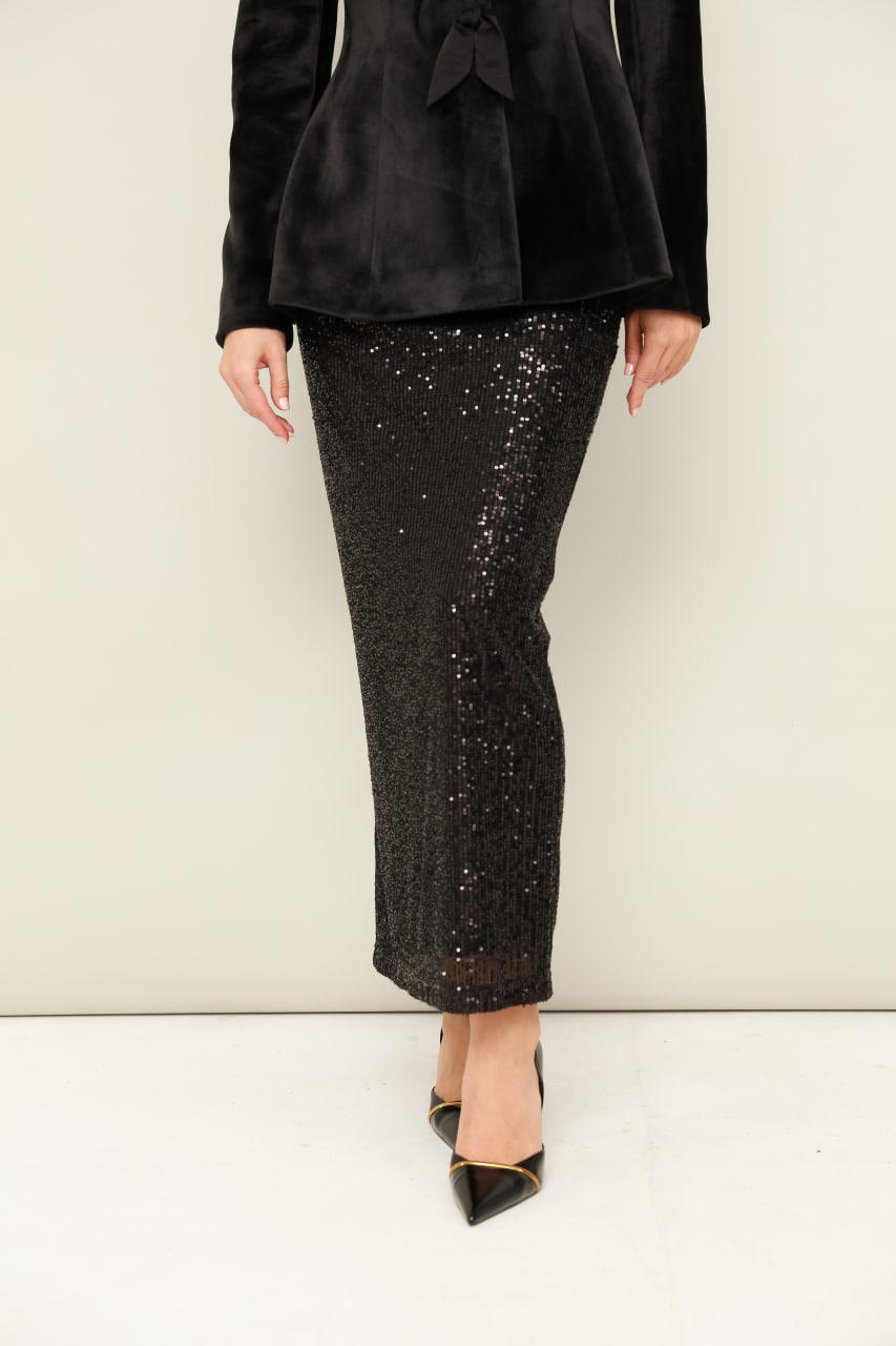 Юбка, декорирванная пайетками, на подкладке. Пояс на резинке,хорошо тянется. Юбка прямого полуприлегающего силуэта.