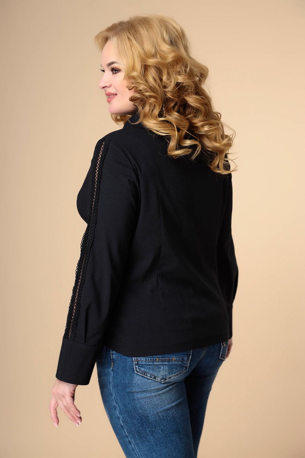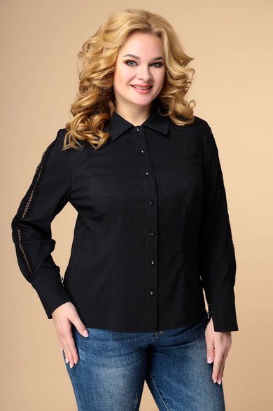 Блузка женская полу прилегающего силуэта, длиной до линии бедер с фигурным низом. Перед с двумя отрезными бочками, с двумя центральными цельно кроенными планками. Спинка с двумя таллиевыми вытачками. Горловина круглая с втачным воротником рубашечного типа с цельно кроенной стойкой. Застёжка центральная на 7 вертикально обмётанных петель и 7 пришивных пуговиц. Рукав в тачной одно шовный, длиный с притачной манжетой с декоративной застёжкой на две навесные петли и две пришивные пуговицы. Центр рукава с декоративной вставкой из кружева. Длина спинки 68 см. длина рукава 63 см.