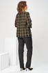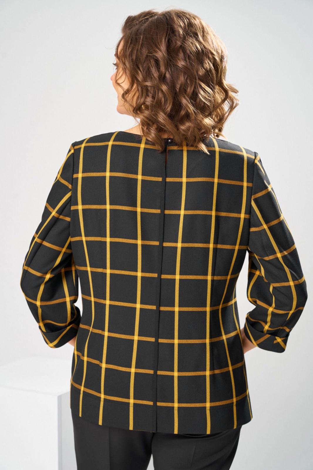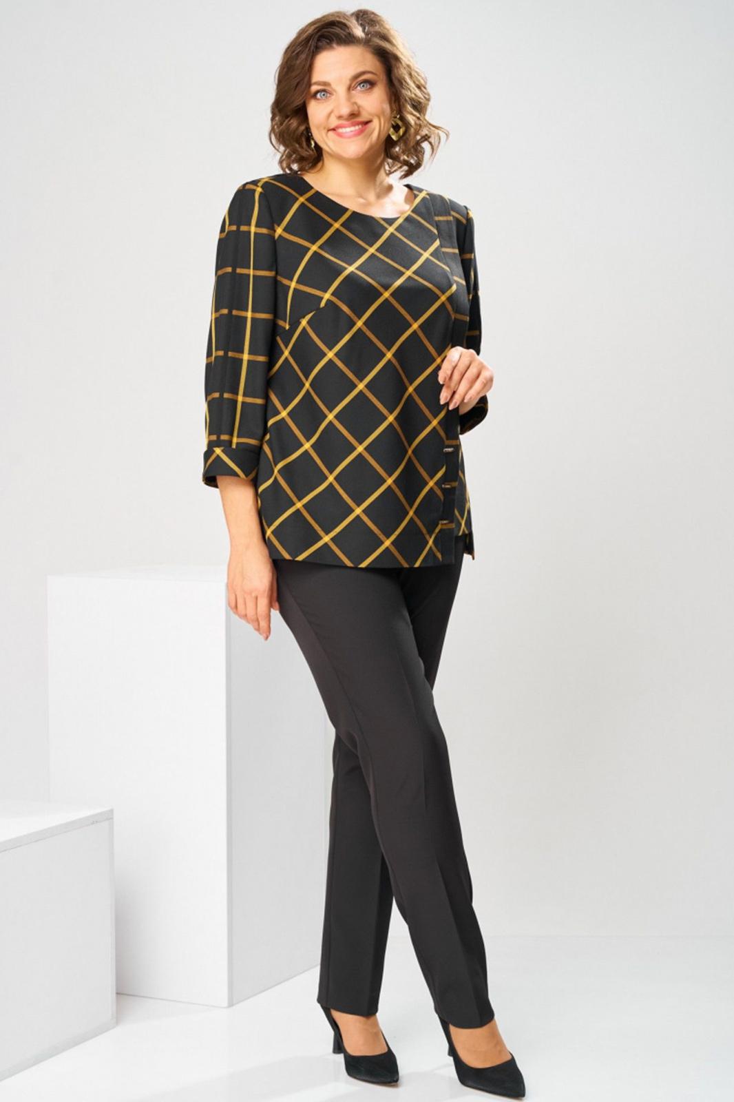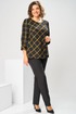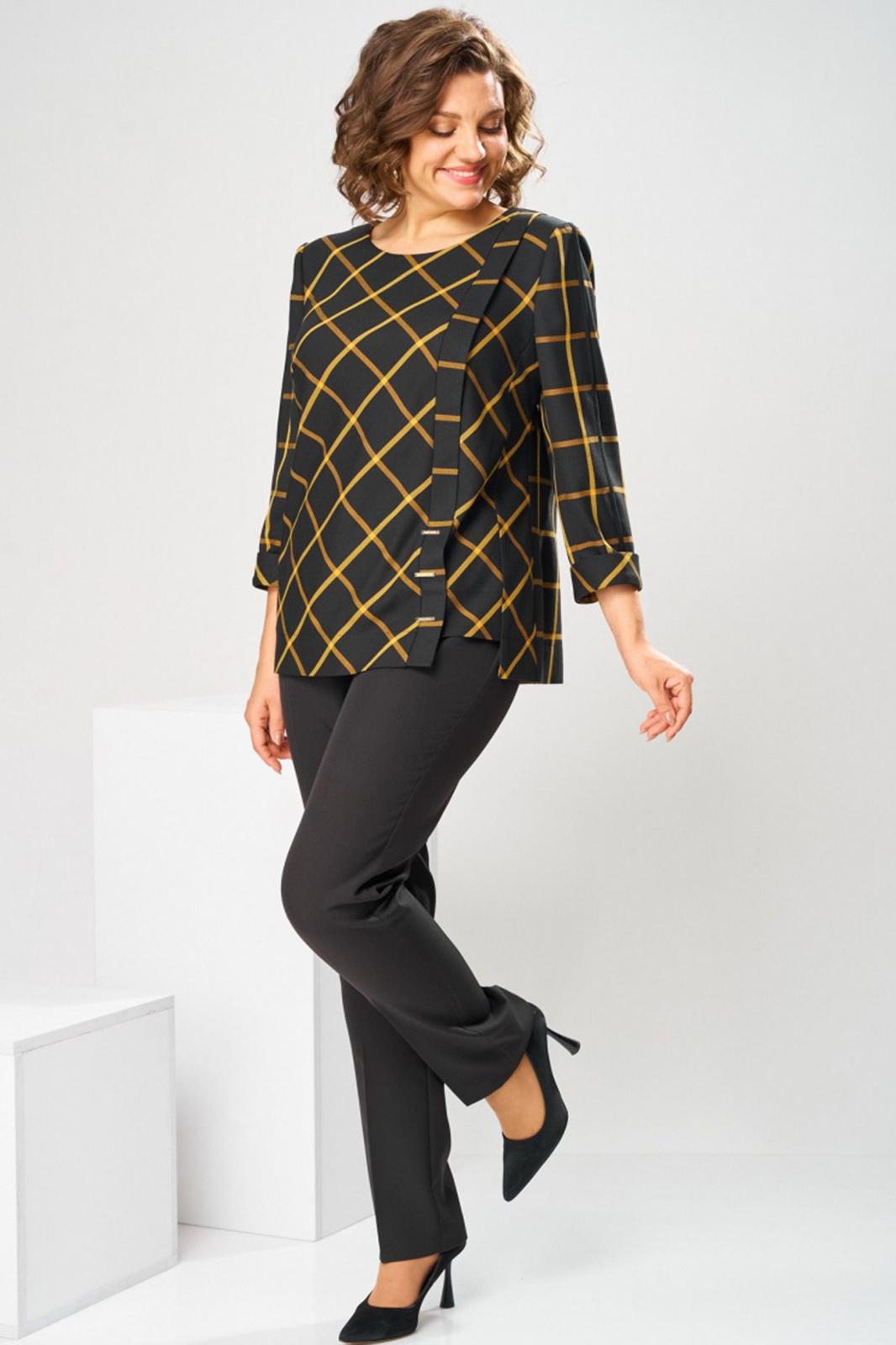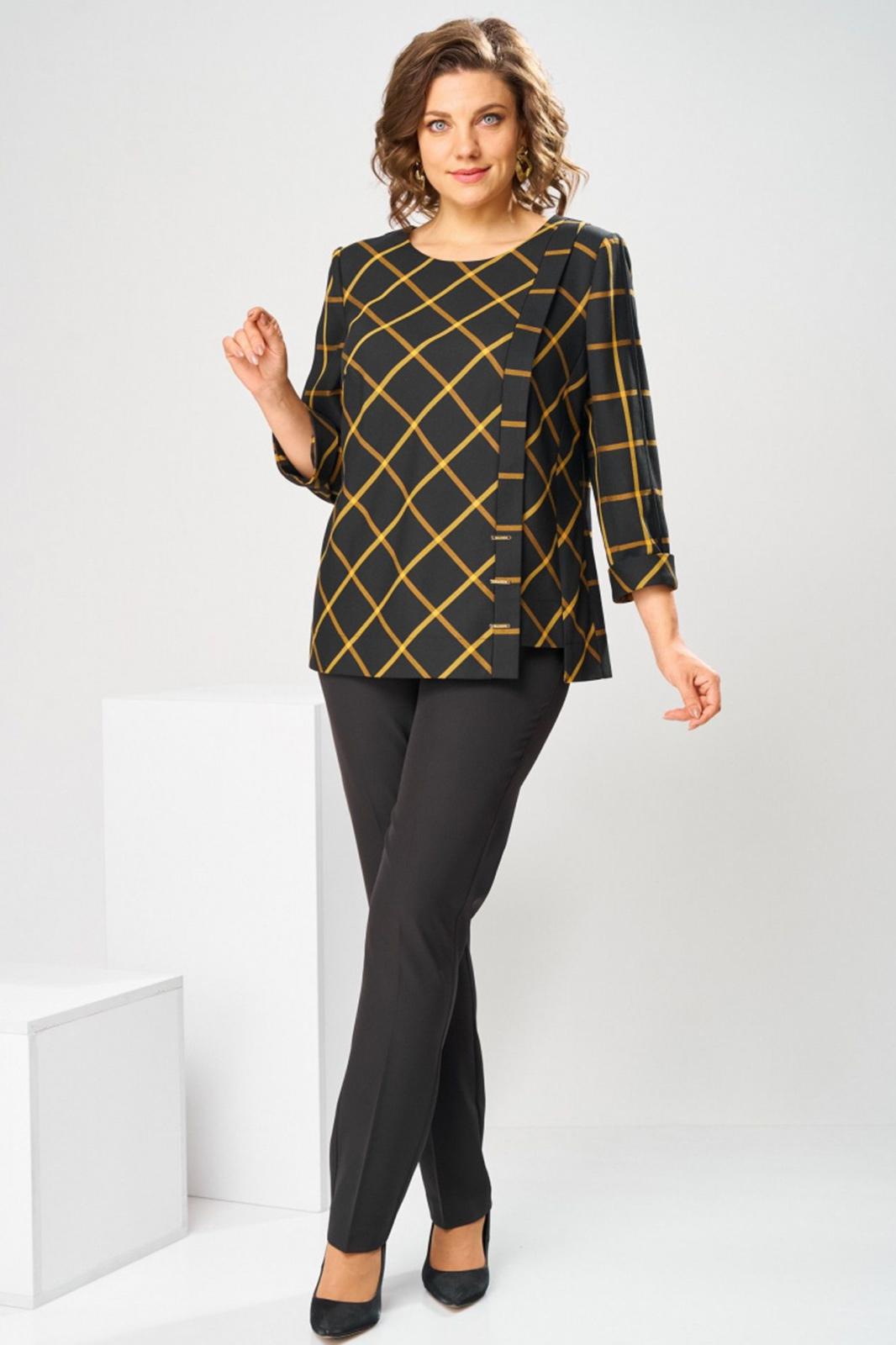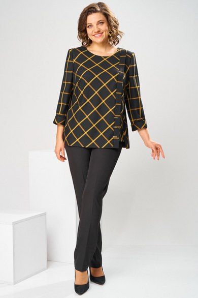 Костюм женский двухпредметный: блузон и брюки. Предназначен для повседневной носки. Блузон полуприлегающего силуэта, диной до линии бедер, с фигурным низом. Перед с одной нагрудной вытачкой, с отрезным рельефом, выходящим из плечевого шва, проходящим через центр груди и до низа, с отрезным бочком. Между центральной частью и рельефом вертикальная обтачная планка. Спинка с двумя талиевыми вытачками, средним швом, левая часть спинки окантована и закреплена на правой. Застежка на одну навесную петлю и одну пришивную пуговицу по горловине спинки. Горловина круглая, обтачная, без воротника. Рукав длиной 7/8. Верхний срез обработан и окантован. Рукав с притачной манжетой. Блузон с плечевыми накладками. Планка переда с тремя пришивными металлическими пластинами. Брюки длинные, слегка заужены к низу, со стрелками. Передние и задние половинки с двумя талиевыми вытачками. Застежка на потайную тесьму-молнию в среднем шве брюк на передних половинках. Верхний срез брюк с притачным поясом с эластичной тесьмой между боковыми швами и вытачками на задних половинок, застегивающийся на одну обметанную петлю и одну пришивную пуговицу. Длина спинки 65 см. Длина рукава 50 см. Длина брюк 103 см
