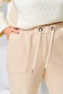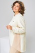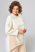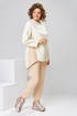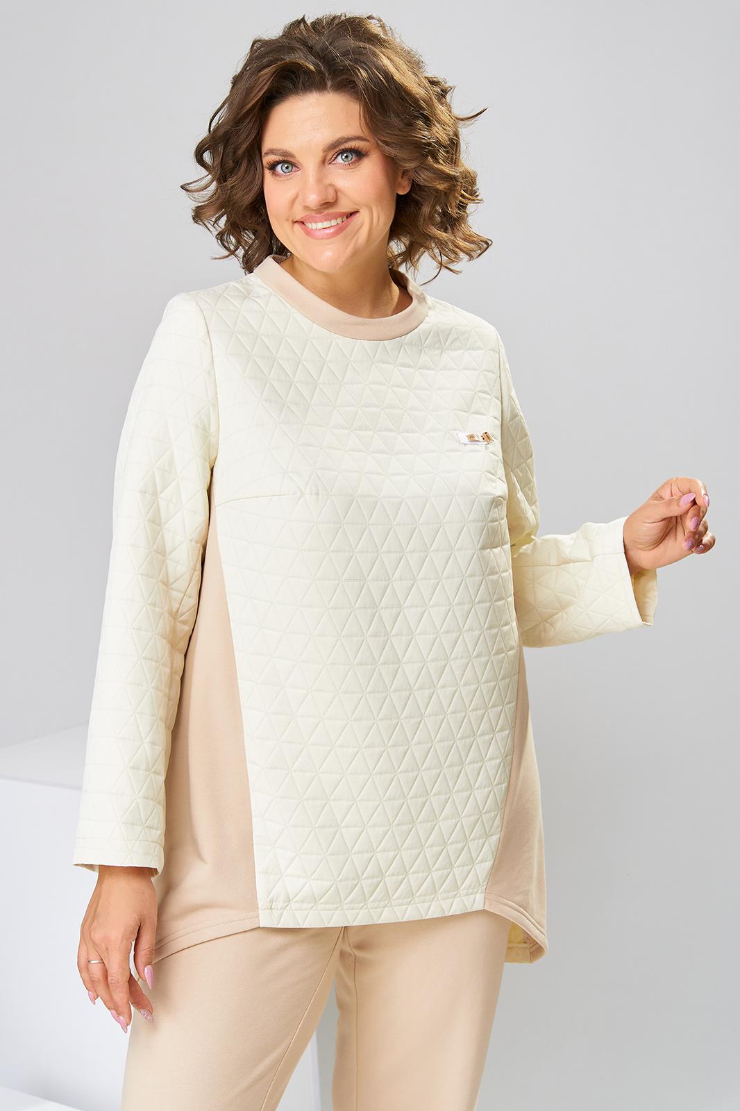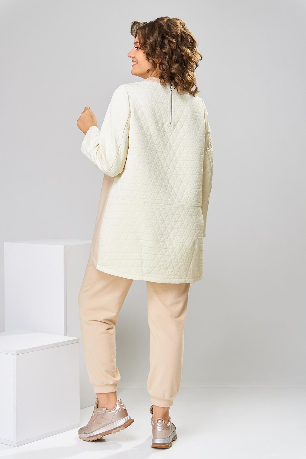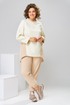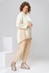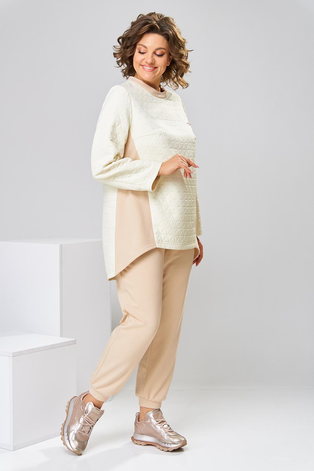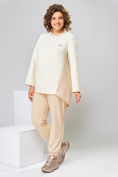 Костюм женский, предназначен для повседневной носки. Костюм женский, 2-х предметный, свитшот и брюки. Свитшот прямого силуэта с фигурным низом. Центральная часть переда из отделочной ткани, с 2-мя нагрудными вытачками. Над левой вытачкой пришивная аппликация; с 2-мя притачными бочками. Спинка из отделочной ткани с горизонтальным подрезом на уровне линии бёдер, нижняя часть подреза с 2-мя конструктивными вытачками. Горловина круглая с приточной планкой. Застёжка на втачную металлическую молнию на спинке. Рукав втачной, 2-х шовный, длинный. Брюки женские, слегка заужены к низу, длинные с притачными манжетами. Передние половинки с накладными прямоугольными карманами. Задние половинки с талевыми вытачками. Брюки с притачным поясом, собранным на эластичную тесьму, закреплённую 2-мя отделочными строчками, образующими кулису с 2-мя пробивными блочками и втянутым декоративным шнуром. Длина брюк по боковому срезу 98 см, Длина спинки свитшота 83 см, длина рукава 59 см.