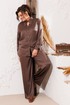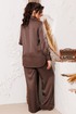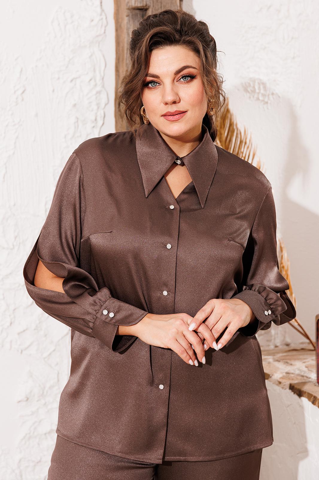 Костюм женский относится к торжественной одежде. Костюм женский, 2-х предметный блузка и брюки. Блузка женская прямого силуэта с фигурным низом. Перед с 2-мя нагрудными вытачками. Спинка цельнокроеная. Боковые швы с разрезами, по спинке с закруглёнными концами. Горловина с V-образным вырезом, с втачным воротником рубашечного типа, с острыми концами, с отрезной стойкой, с застёжкой на стойке на 1-ну обмётанную пришивную пуговицу. Застёжка центральная бортовая на 2-ть обмётанных петель и 5-ть пришивных пуговиц. Блузка со спущенным плечом. Рукав втачной 2-х шовный, с разрезом верхнего шва, по низу со сборкой с застёжкой на 2-е обмётанные петли и 2-е пришивные пуговицы. Рукав длинный. Блузка без плечевых накладок. Брюки женские длинные прямые. Передние половинки с карманами в боковых швах. Задние без конструктивных особенностей. Брюки с притачным поясом, собранным на эластичную тесьму. Длина брюк по боковому срезу 101 см. Длина спинки 76 см, длина рукава 57 см.