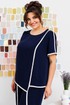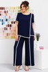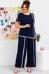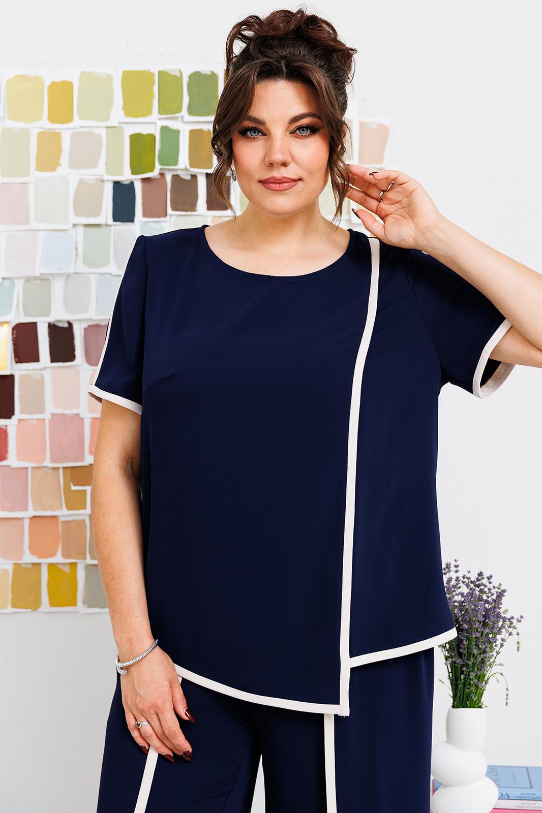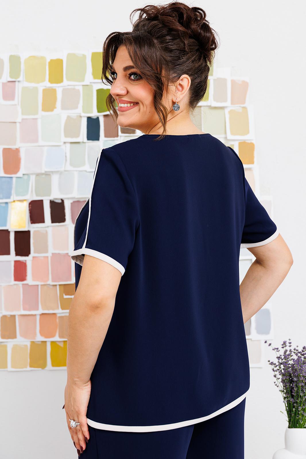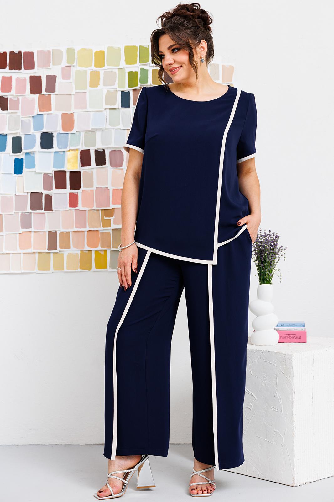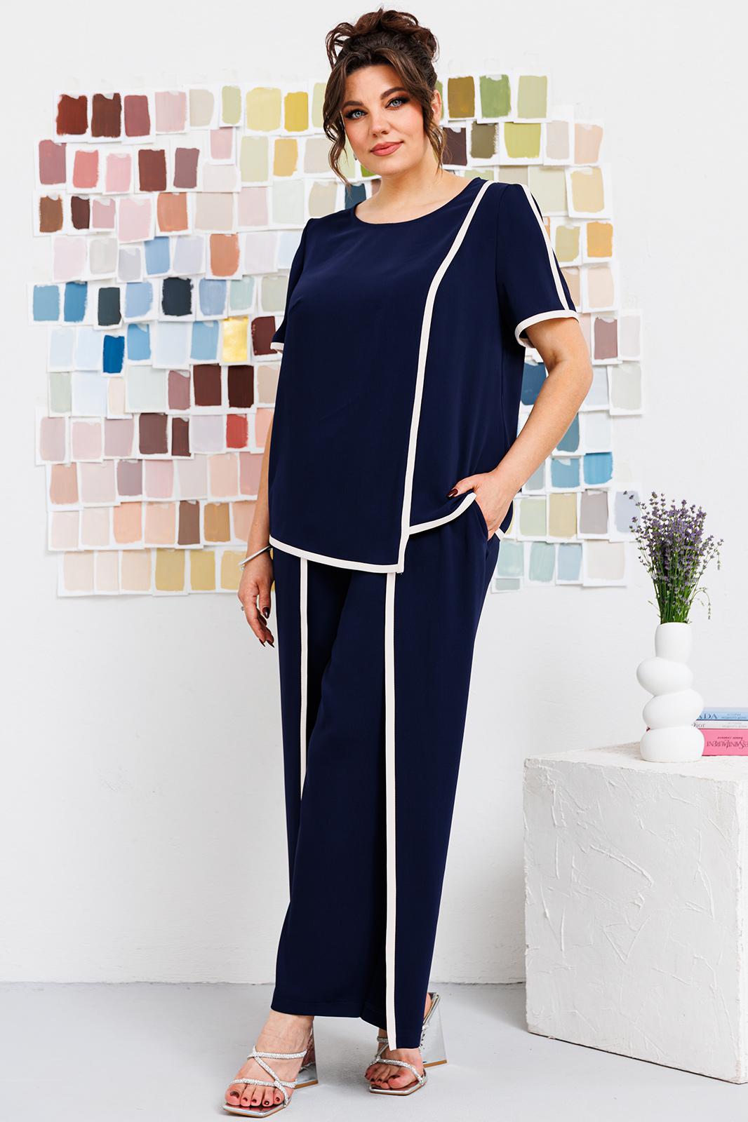 Костюм женский, может использоваться как нарядный, так и для повседневной носки. Костюм женский, 2-х предметный блузон и брюки. Джемпер прямого силуэта длиной ниже линии бёдер, с фигурным низом. Перед с 1-ной нагрудной вытачкой с 1-ним отрезным рельефом, выходящим из плечевого шва. Спинка цельнокроеная. Горловина обточная без воротника. Рукав втачной, короткий, 2-х шовный. Шов притачивания рельефа переда, верхний шов рукава и низ блузона обработан кантом из отделочной ткани шириной 1,1 см. Блузон с плечевыми накладками. Брюки женские прямые длинные. Передние половинки с карманами, в боковых швах с отлётными деталями, с отделочным кантом из отделочной ткани шириной 1,1 см. Задние половинки с таллиевыми вытачками. Передние с притачным поясом, собранным на эластичную тесьму, закреплённую 2-мя строчками. Длина брюк по боковому срезу 99 см. Длина спинки блузона 64 см, длина рукава 25 см.