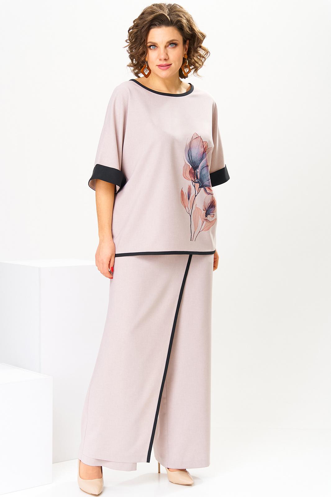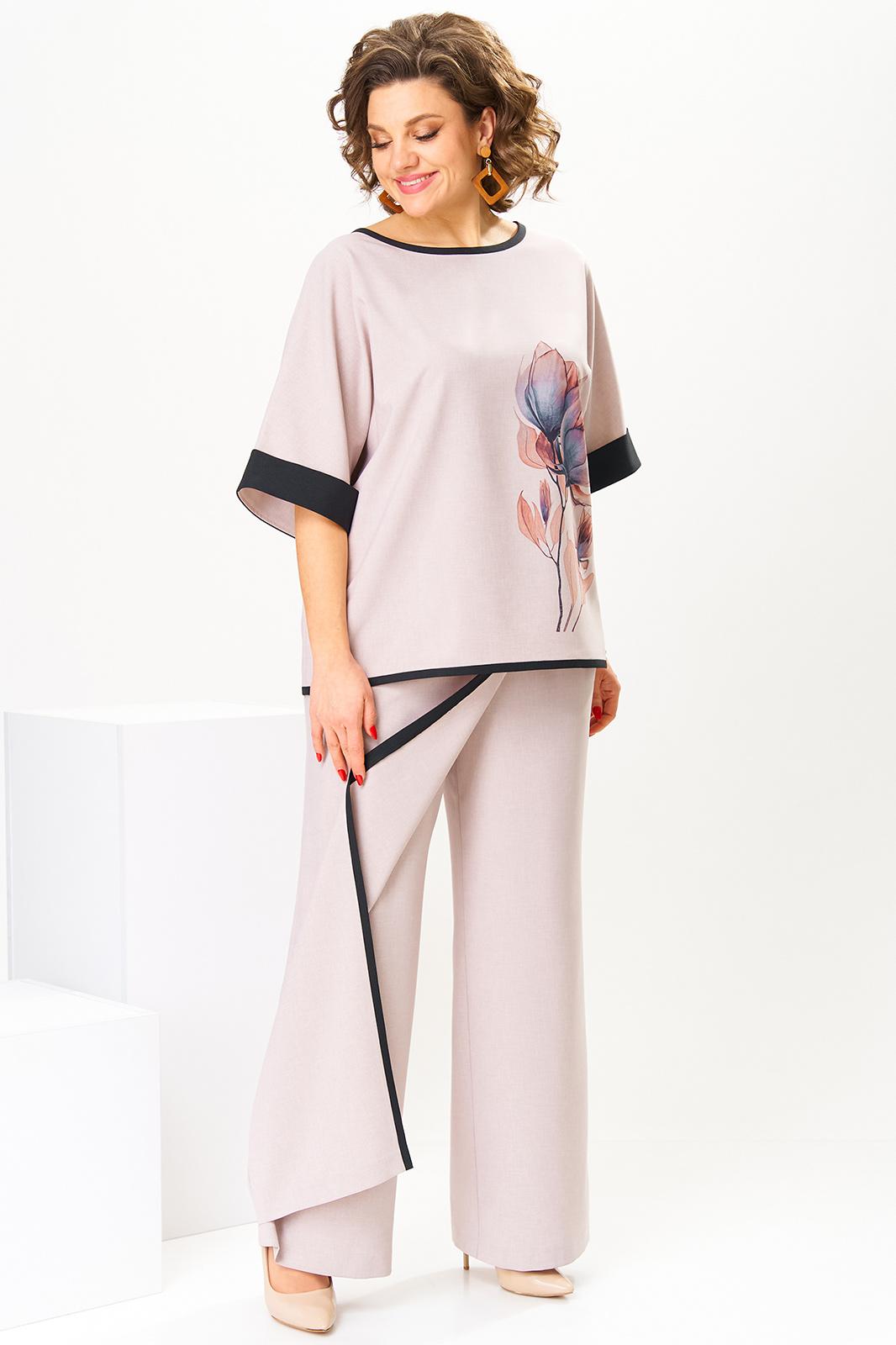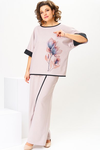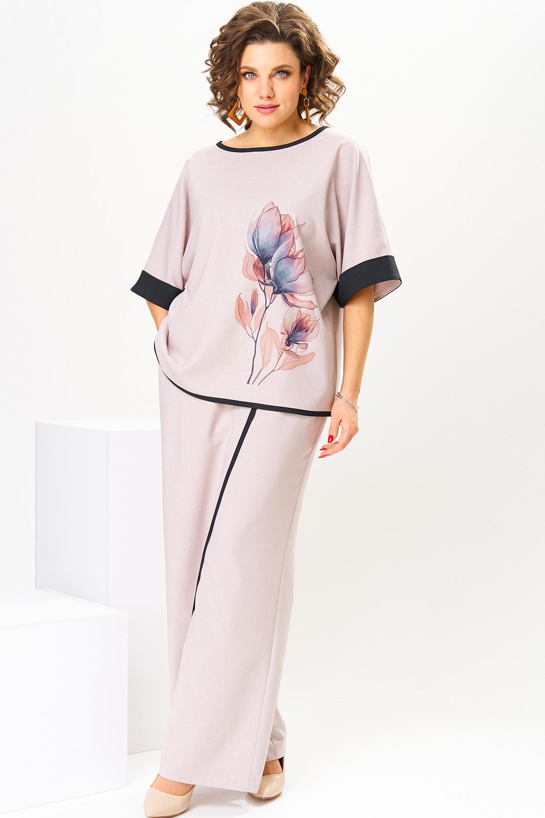 Костюм женский предназначен для повседневной носки. Костюм женский, 2-х предметный блузон и брюки. Блузон женский прямого силуэта, длиной до линии бёдер. Перед цельнокроеный, декорирован принтом. Спинка цельнокроеная. Горловина круглая, с притачным отделочным кантом. Рукав цельнокроеный, длиной до локтя, с притачной отложной манжетой из отделочной ткани. Низ блузона с притачным отделочным кантом. Блузон без плечевых накладок. Брюки женские, прямые, длинные. Передние половинки с карманами в боковых швах с отрезными бочками. Задние половинки с таллиевыми вытачками. Брюки с отлетной ассиметричной деталью, закреплённой в правом боковом шве, с отделочным притачным кантом. Брюки с притачным поясом, частично собранным на эластичную тесьму, закреплённую 2-мя отделочными строчками. Длина брюк по боковому срезу 104 см. Длина спинки блузона 63 см, ширина рукава вверху 23 см.