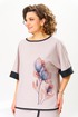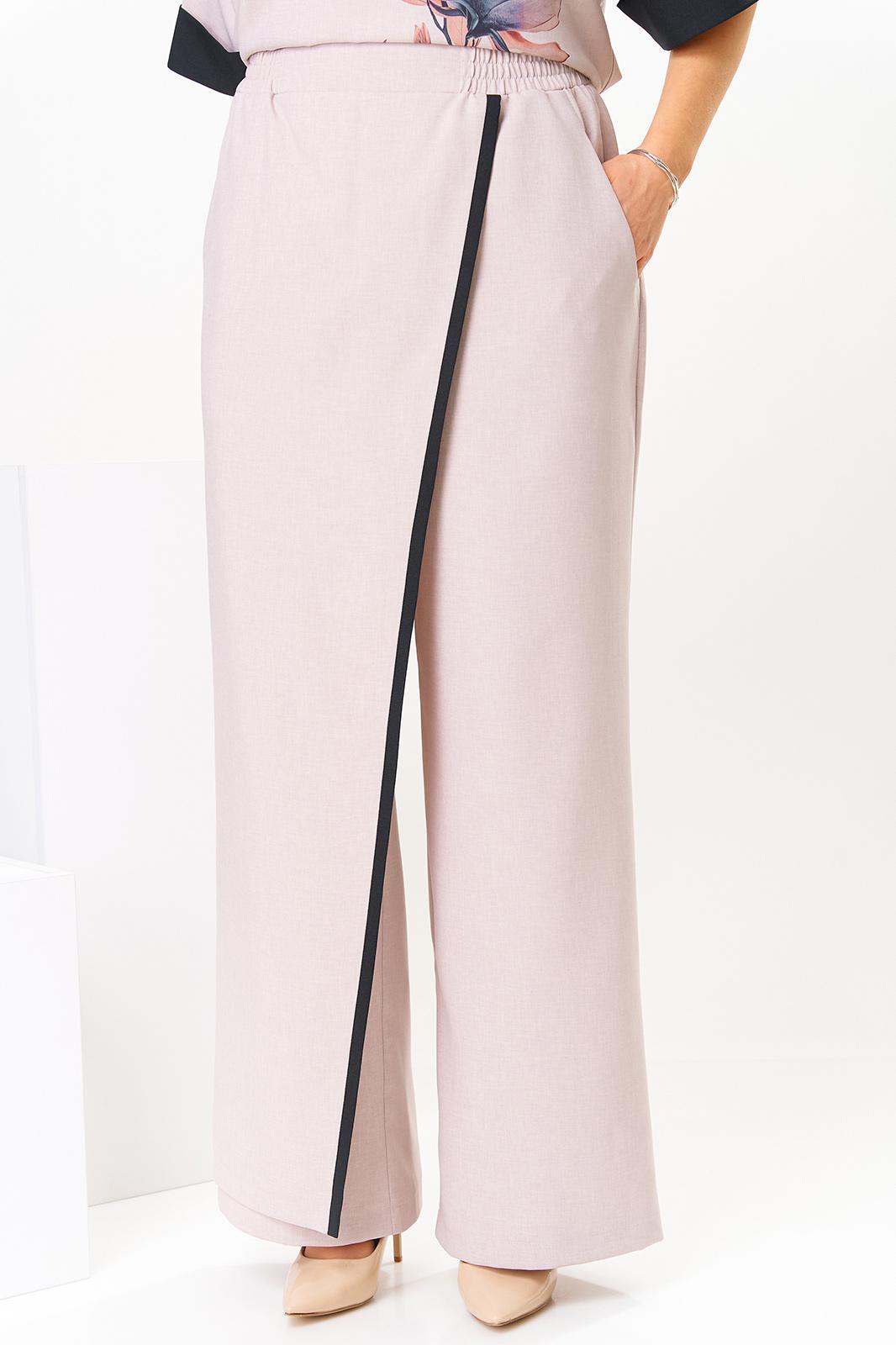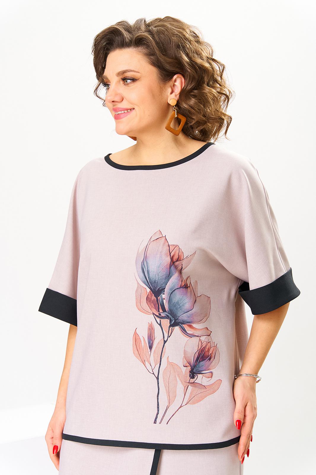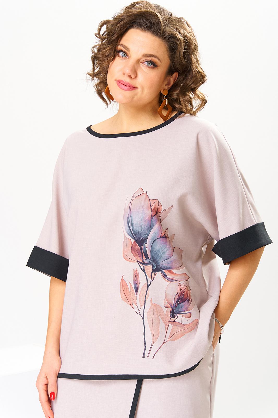 Костюм женский предназначен для повседневной носки. Костюм женский, 2-х предметный блузон и брюки. Блузон женский прямого силуэта, длиной до линии бёдер. Перед цельнокроеный, декорирован принтом. Спинка цельнокроеная. Горловина круглая, с притачным отделочным кантом. Рукав цельнокроеный, длиной до локтя, с притачной отложной манжетой из отделочной ткани. Низ блузона с притачным отделочным кантом. Блузон без плечевых накладок. Брюки женские, прямые, длинные. Передние половинки с карманами в боковых швах с отрезными бочками. Задние половинки с таллиевыми вытачками. Брюки с отлетной ассиметричной деталью, закреплённой в правом боковом шве, с отделочным притачным кантом. Брюки с притачным поясом, частично собранным на эластичную тесьму, закреплённую 2-мя отделочными строчками. Длина брюк по боковому срезу 104 см. Длина спинки блузона 63 см, ширина рукава вверху 23 см.