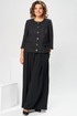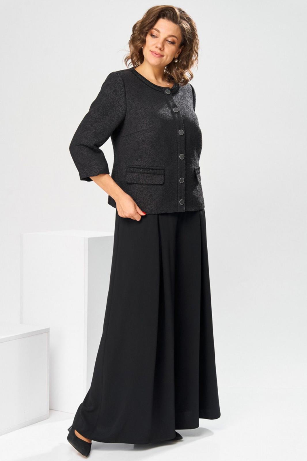 Костюм женский относится к нарядной торжественной одежде. Костюм женский 2-х предметный жакет и брюки. Жакет женский полуприлегающего силуэта, длиной до линии бёдер. Перед с 2-мя нагрудными вытачками с притачными планками по горловине, декорированными надстрочной отделочной тесьмой, с 2-мя надстрочными вертикальными планками, с 2-мя прорезными карманами с клапаном с закруглёнными концами и листочкой, клапан декорирован надстрочной отделочной тесьмой, карманы расположены ниже линии талии на 2 см. Спинка с 2-мя таллиевыми вытачками и средним швом. Горловина круглая, обточная, без воротника. Застёжка центральная бортовая на 6-ть вертикально обмётанных петель и 6-ть пришивных пуговиц. Рукав 2-х шовный втачной, длиной 3/4. Жакет на притачной подкладке. Брюки женские, широкие, длинные. Передние половинки со встречными складками с карманами в боковых швах. Задние половинки без конструктивных особенностей. Брюки с притачным поясом, собранным на эластичную тесьму, закреплённую 2-мя отделочными строчками. Длина спинки жакета 58 см, длина рукава 48 см. Длина брюк по боковому срезу 99 см.