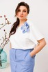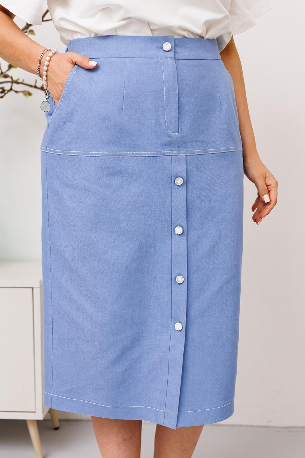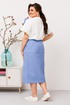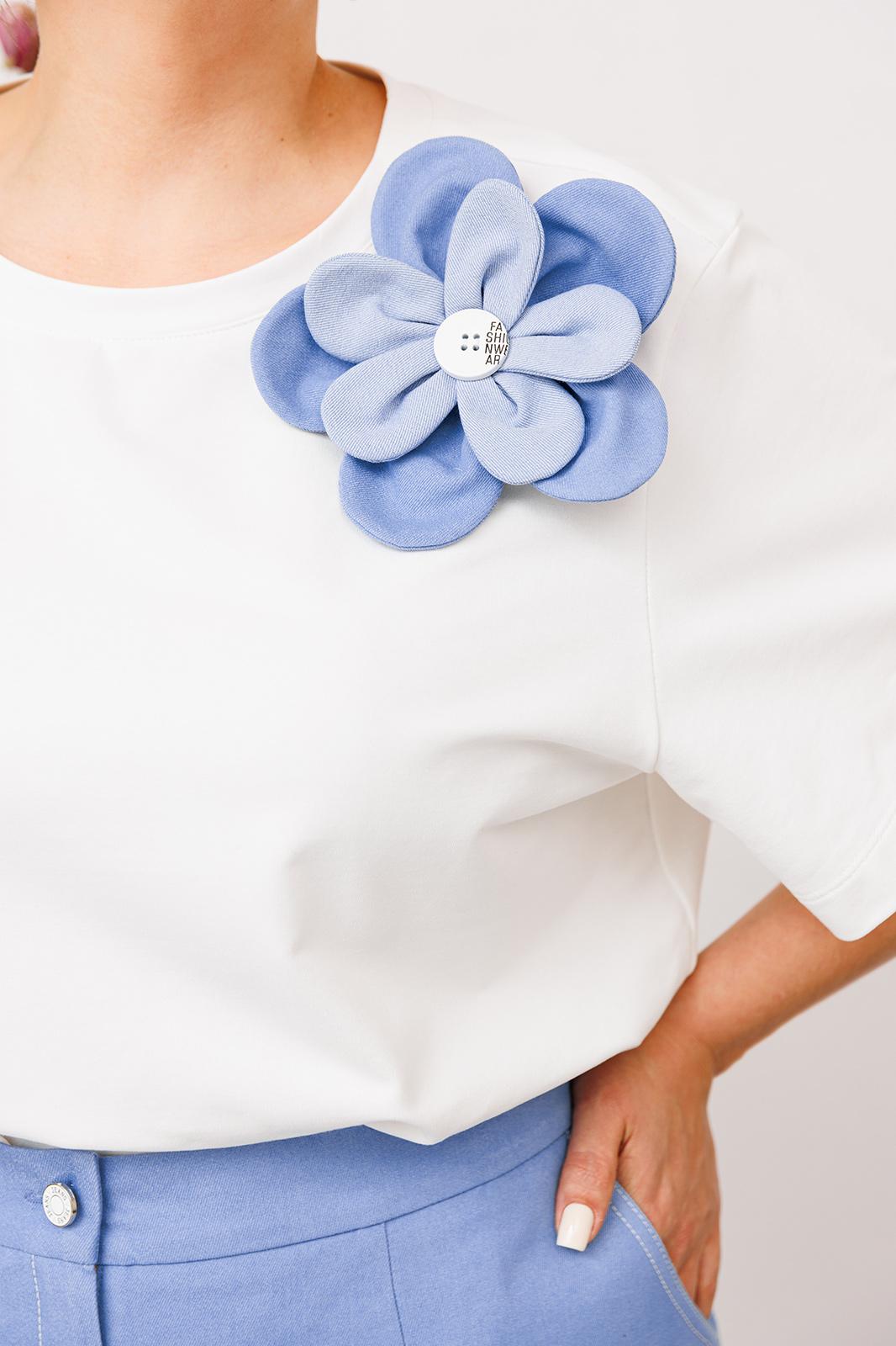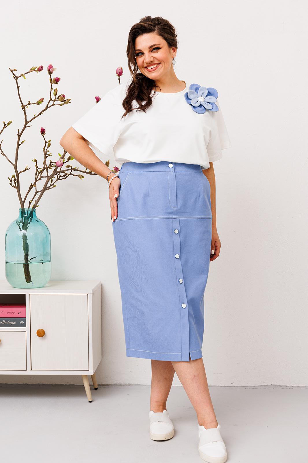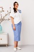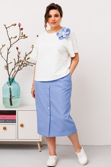 Костюм женский, предназначен для повседневной носки. Костюм 2-х предметный блузка и юбка. Блузка женская, прямого силуэта, длиной до линии бёдер. Перед и спинка цельнокроеные. Перед декорирован съёмным украшением. Горловина круглая, с втачной планкой. Блузка со спущенным плечом. Рукав втачной короткий, одно шовный. Блузка без плечевых накладок. Юбка женская прямая, длиной до середины икры. Переднее полотнище с отрезной кокеткой, с 2-мя карманами в боковых швах., с притачной планкой, с застёжкой на 4 обмётанные петли и 4-и пришивных пуговицы. Заднее полотнище с 2-мя таллиевыми вытачками на отрезной кокетке. Юбка на застёжке на переднем полотнище на тесьму-молнию. Юбка с притачным поясом, частично (по спинке) собранным на эластичную тесьму, на застёжку на 1-ну обмётанную петлю и 1-ну пуговицу. Отделочные строчки на юбке выполнены контрастными нитками. Длина юбки по боковому срезу 78 см. Длина спинки блузки 56 см, длина рукава 21,5 см.